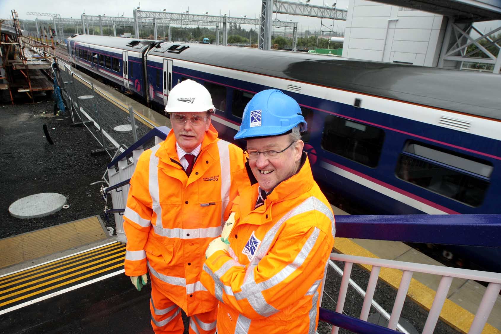 Network Rail director Scotland, Ron McAulay and Scottish Transport Minister Stewart Stevenson got an exclusive preview of the new Bathgate Station when they visited the work site recently to review progress on the construction of the Airdrie-Bathgate rail link project.