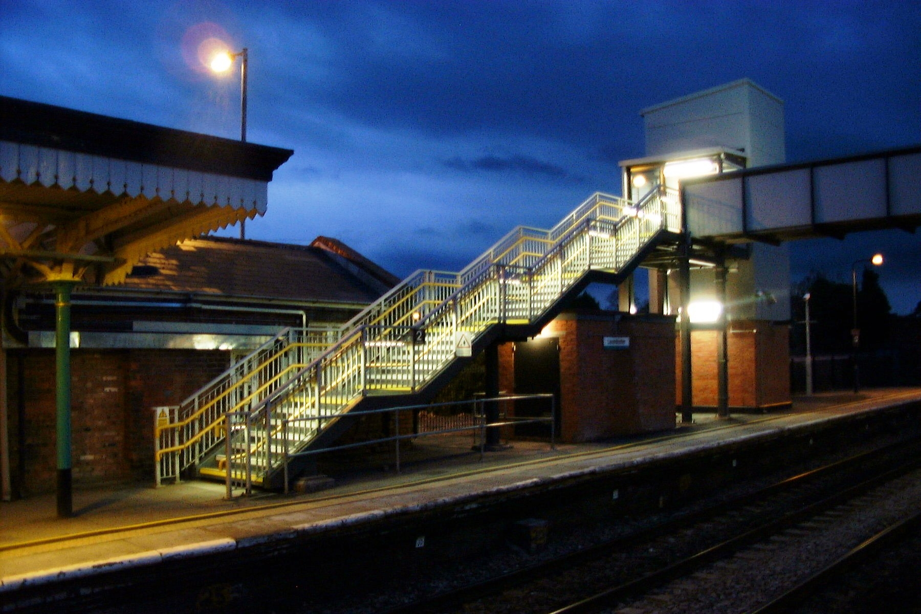 Photo Caption: the footbridge at Leominster Station with lighting similar to that which will be fitted at the Burry Port Station footbridge.