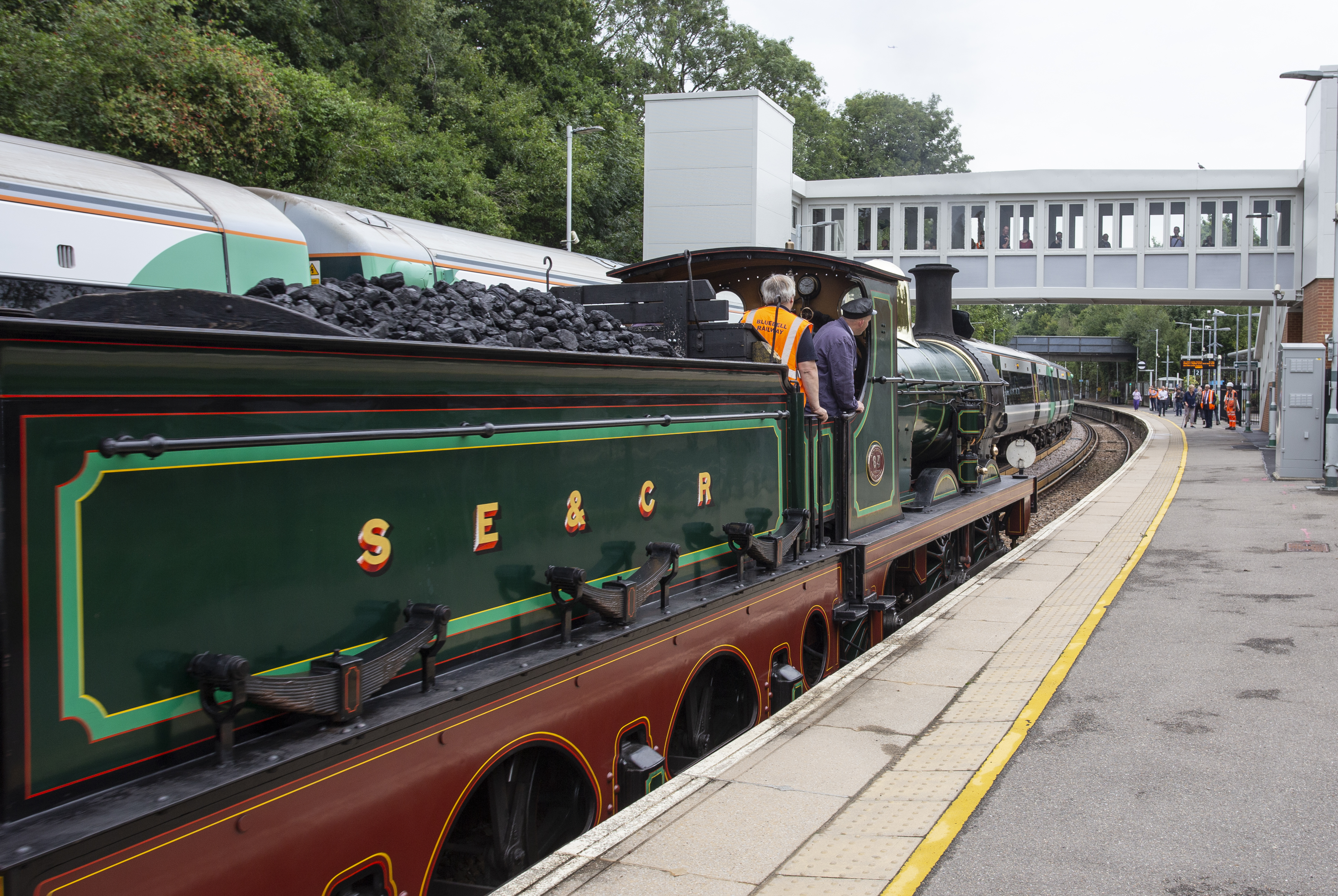 Bluebell Railway locomotive number 65, dating from 1896, made a special appearance to mark the occasion, pulling into platform 2 to mark the first time it had run on main line tracks since 1963.