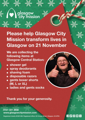 Glasgow Central station is encouraging passengers to show their generosity this Thursday by donating clothes and toiletries to the Glasgow City Mission.