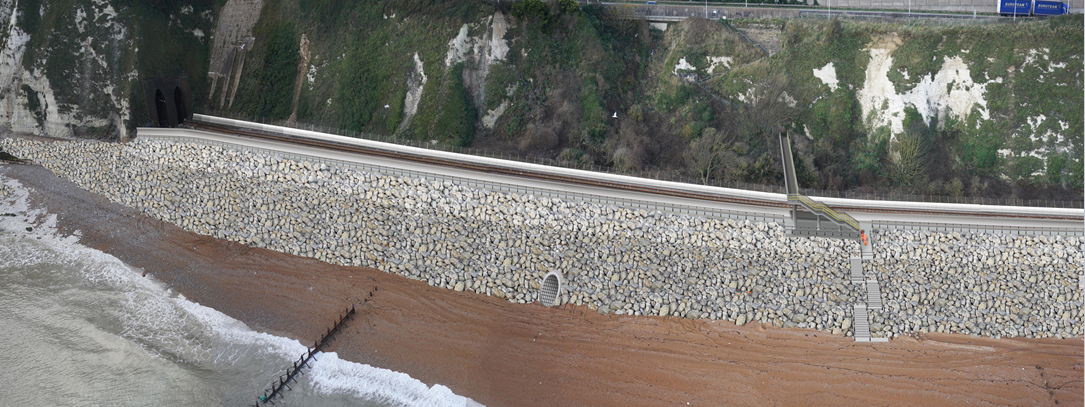 The railway on Shakespeare Beach was originally raised on wooden trestles, with the waves breaking on the beach below. In 1927, the Southern Railway constructed the sea wall alongside it and dumped many thousands of tonnes of chalk around the viaduct, encasing it and building the railway on top. A large section of the wall was damaged, breaking its foundation at Christmas. The scale of the damage means reconstruction will be on a much wider scale than the work we had to undertake following storm damage at Dawlish, encompassing a longer section of railway, a very different type of failure, twice the tide heights and a much higher wall (10m).