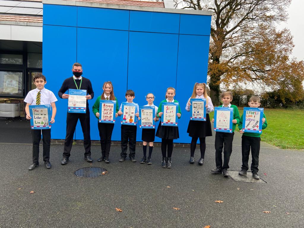 Photo caption: Lingwood Primary Academy students with Mr Stuart Walker, Headteacher, and the posters they designed