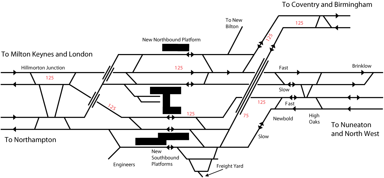 - Changes to all 13 major junctions on the route, including a significant bottleneck at Rugby, enabling trains to travel at up to 125mph