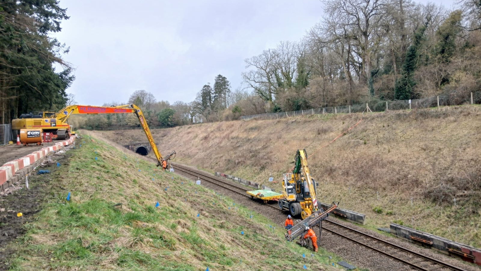 A team of engineers worked around the clock to stabilise the cuttings – the steep banks either side of the railway – using soil nails which are drilled into the banks at either end of Gillingham Tunnel to protect that part of the line from landslips that have previously impacted services.