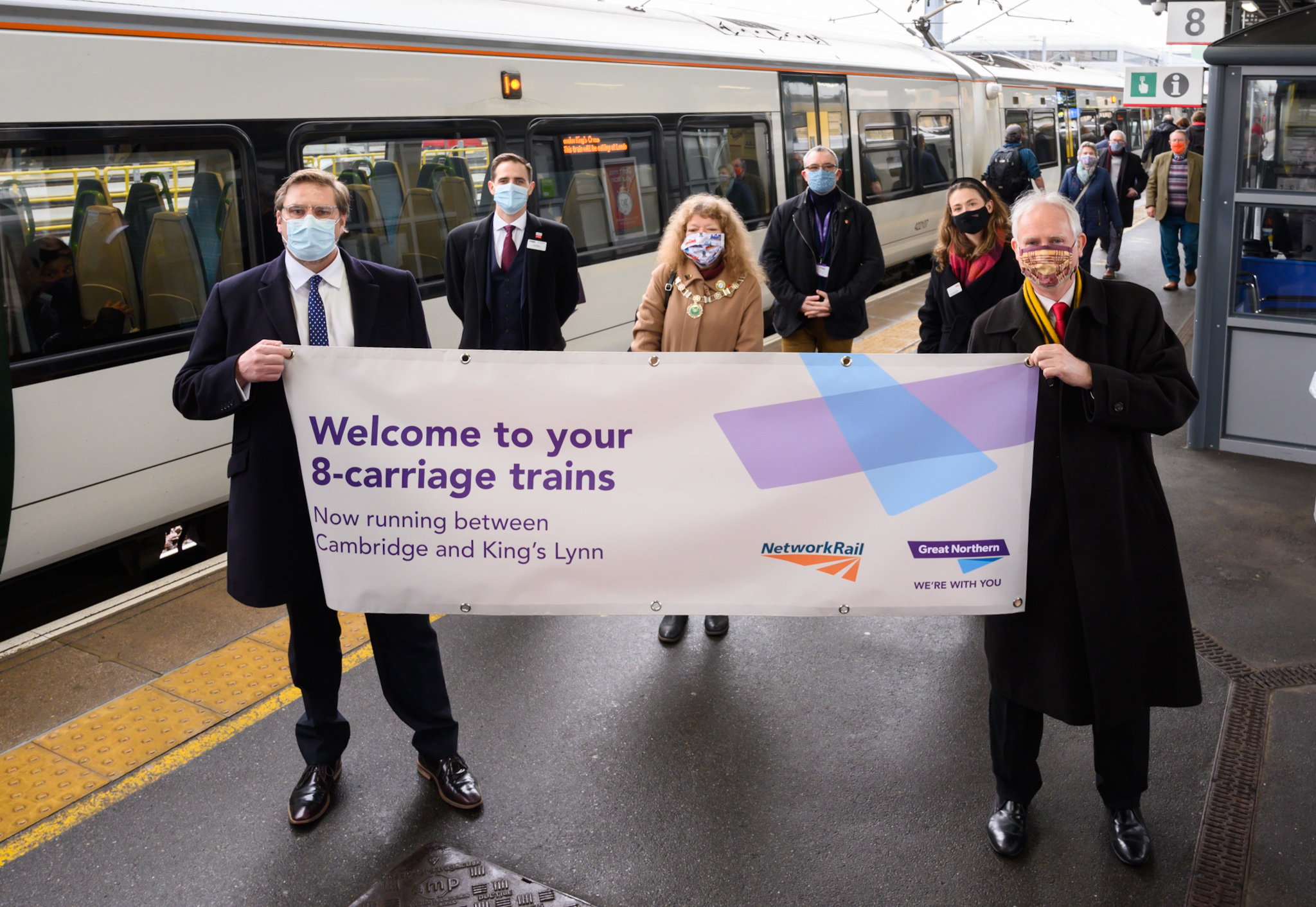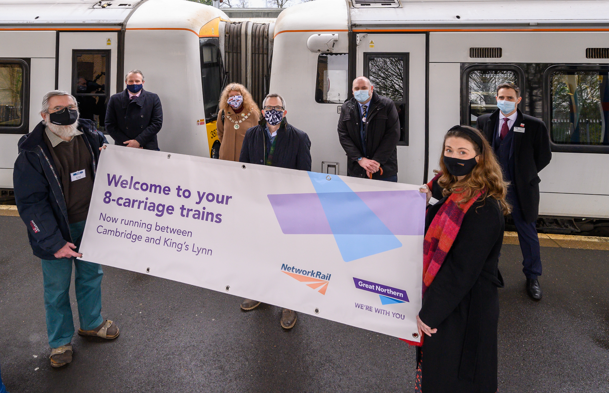 Great Northern and Network Rail today (Friday 11 December) gave passengers on the Fen Line between Cambridge and King’s Lynn a taste of the new twice-longer eight-carriage service that will boost space and seats on trains from Sunday (13 December).