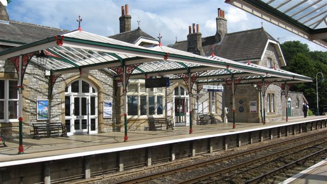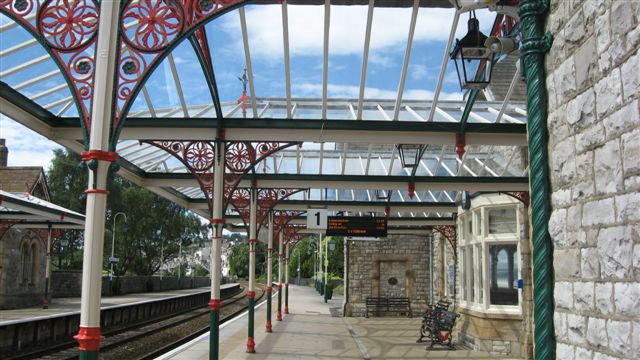 Grange-over-Sands station has ornate Victorian glass canopies at the front of the station building and above both platforms, incorporating fine filigree work and finials.
