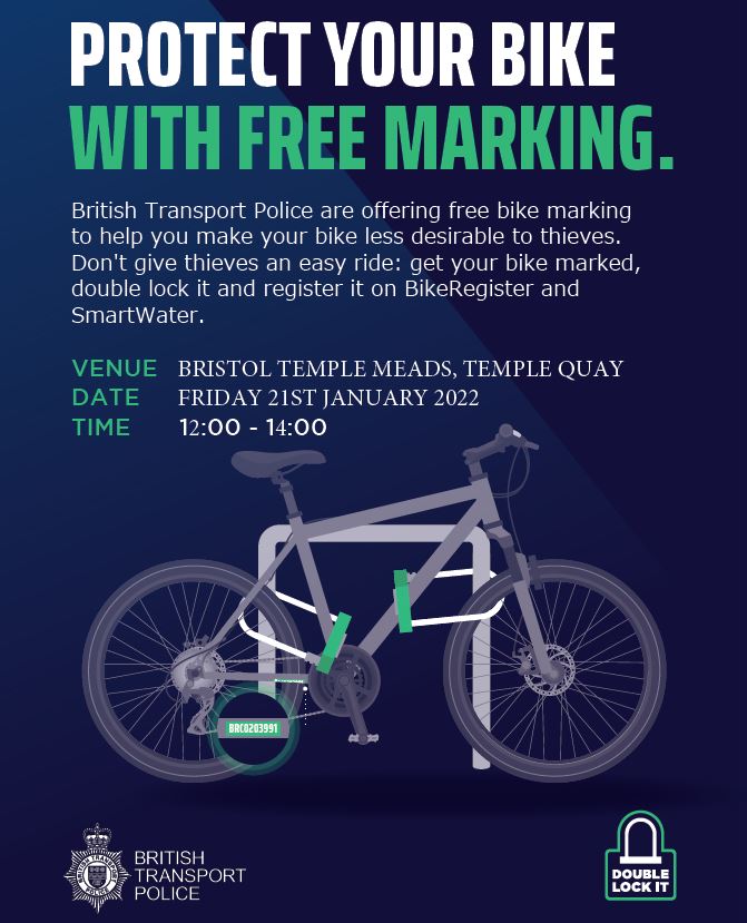 Cyclists who want to enhance the security of their bicycles are welcome to come along to the Temple Meads bike park at the Friary tomorrow (Friday 21 January), to have their bikes marked by the British Transport Police for free.