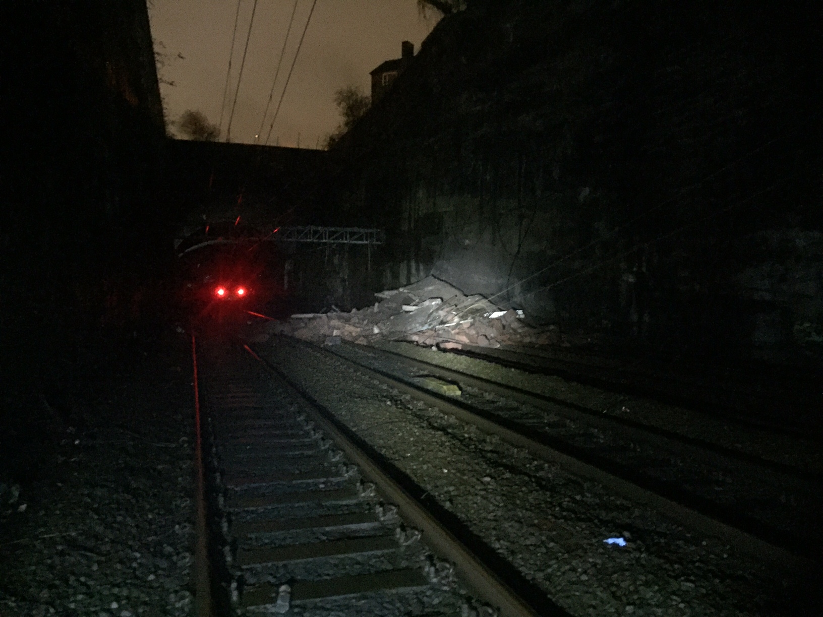 A spokesperson for Network Rail said: "No trains are running in or out of Liverpool Lime Street station after a section of trackside wall, loaded with concrete and cabins by a third party, collapsed sending rubble across all four lines and taking overhead wires with it.