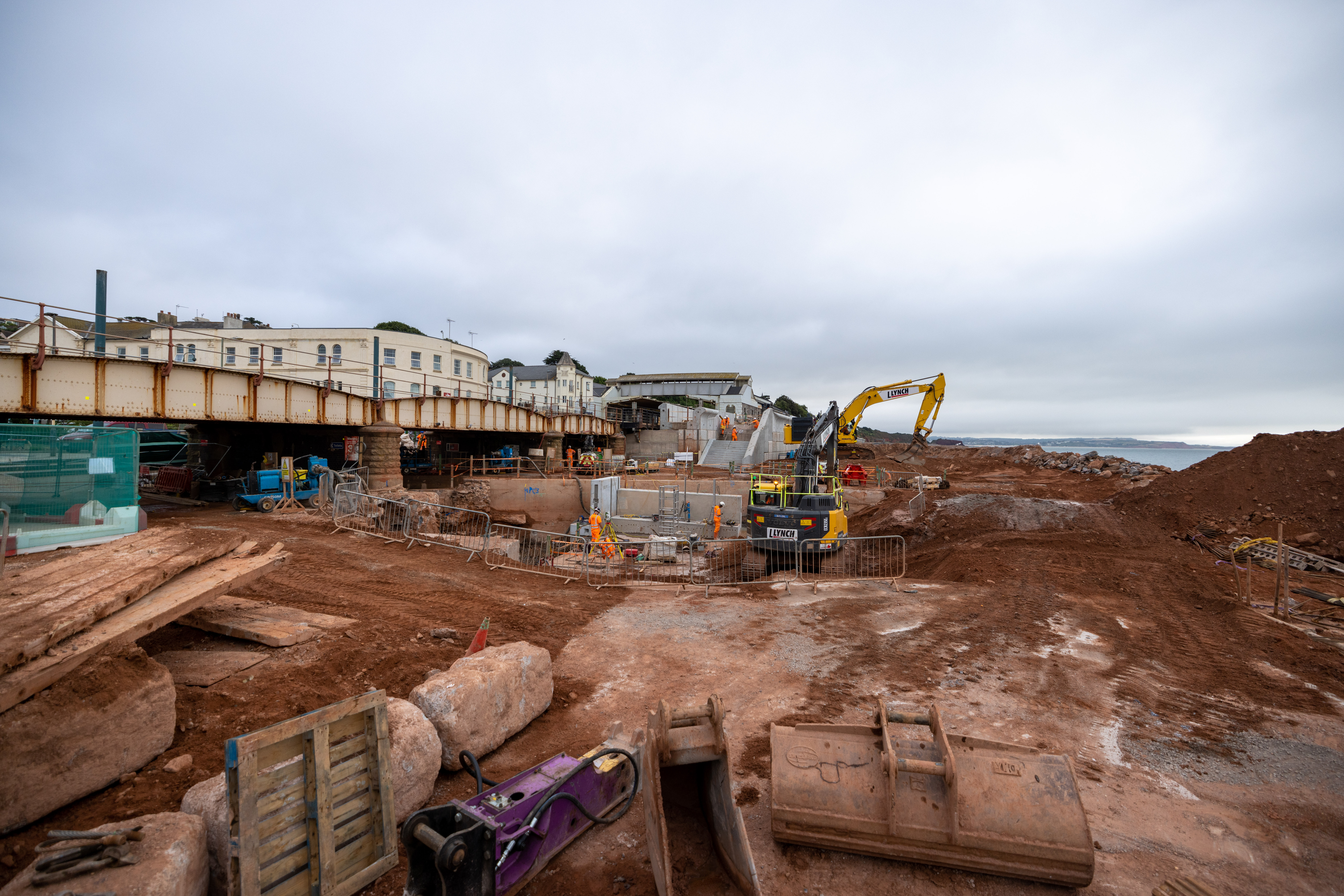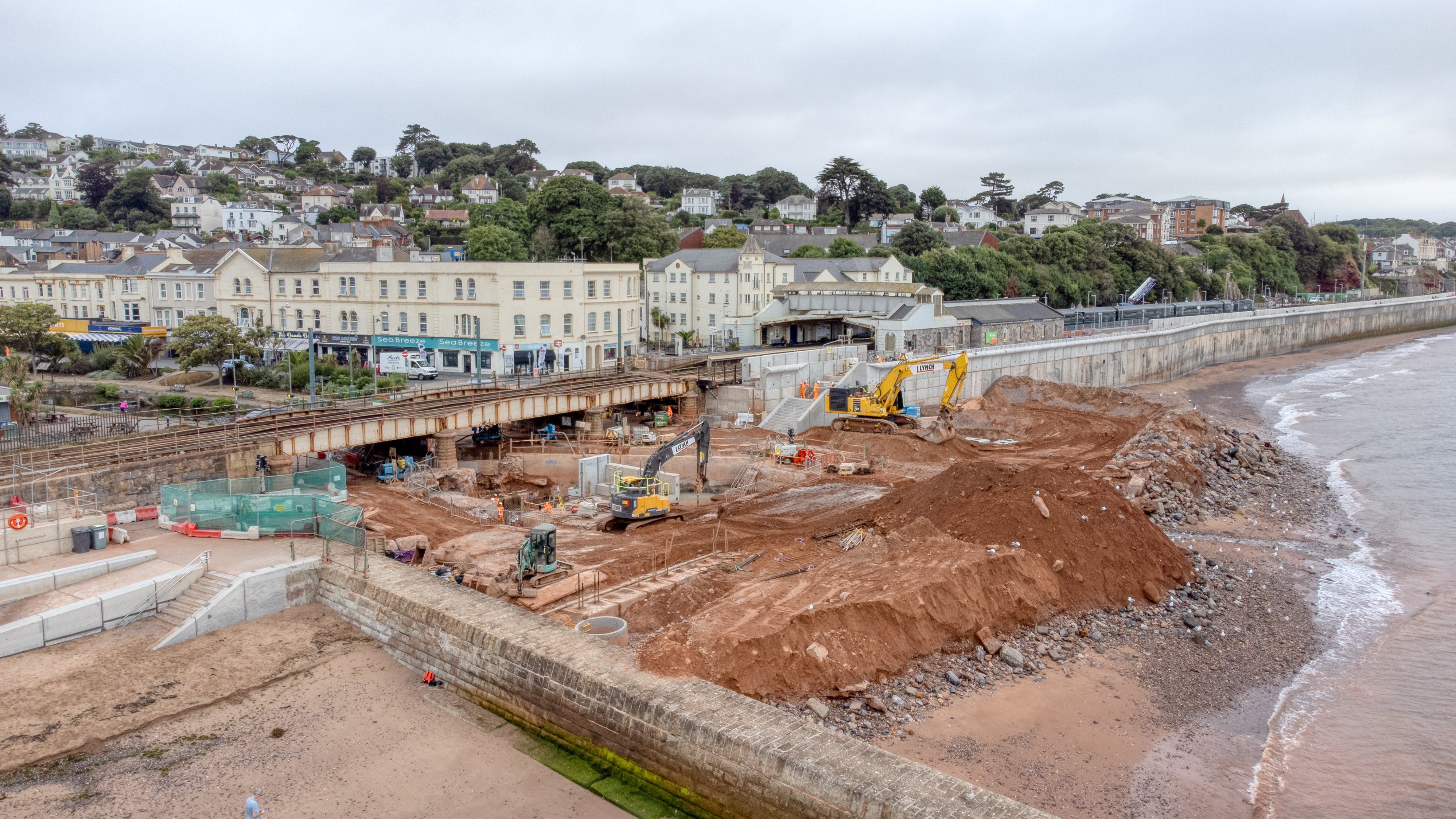 The first section of new sea wall – which runs for 360 metres along Marine Parade south west of Dawlish station – was completed in July 2020. Construction of the 415 metre second section – stretching from Coastguard breakwater northeast of Dawlish station to Colonnade breakwater – began in November 2020.