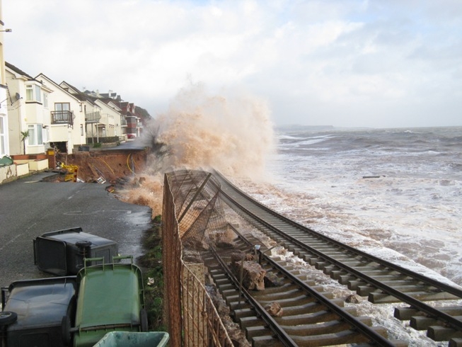 - 4/5 February: Seawall at Riviera Terrace collapsed, creating an 80m-wide crater on the railway and leaving the railway track hanging. Rail services between Exeter and Plymouth suspended