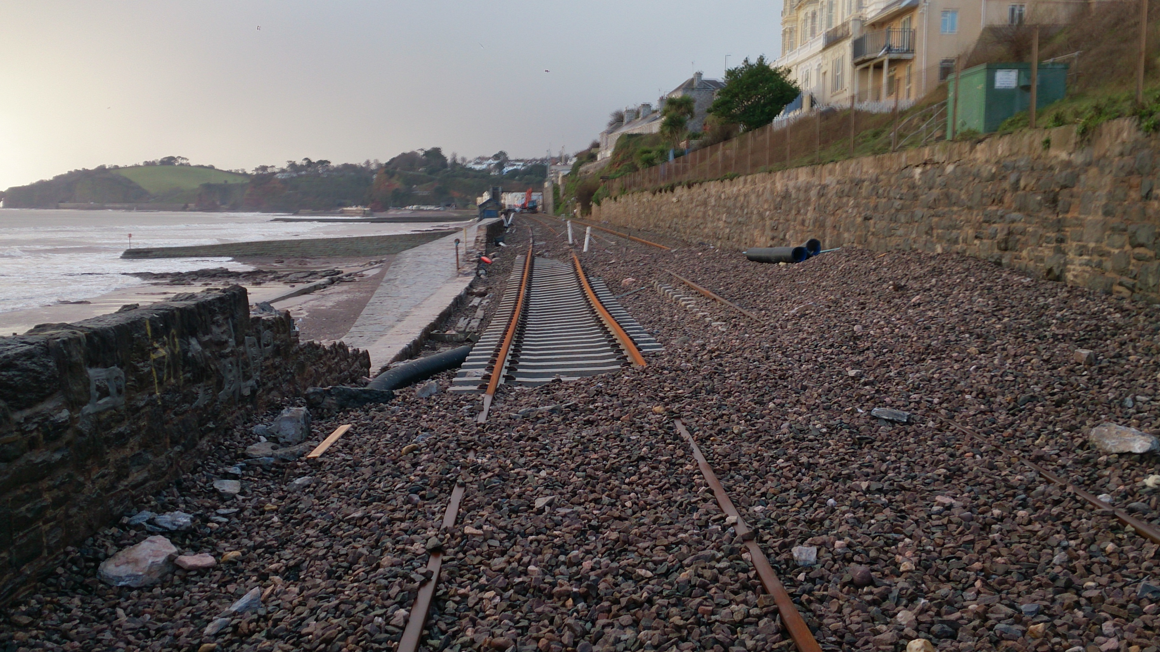 Work resumed immediately after the storm of the 14th and engineers have since laid concrete foundation into the main breach and the secondary breach at Dawlish Warren. They have also started work on repairing the station platform and clearing more debris throughout the coastal route. To protect the site, 15 steel containers - weighing around 70tonnes each - have been installed as temporary breakwater and a scaffold bridge was also built to reconnect services and signalling equipment.