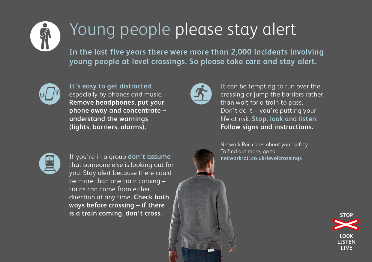 “We have one of the safest railways in Europe but still tragically a number of young people have lost their lives at level crossings in recent years. Many have seemingly been distracted by their phones, music or conversation. We’ve created some simple tips and advice to help students cross the railway safely and with confidence – put simply, stay alert and stay alive.”