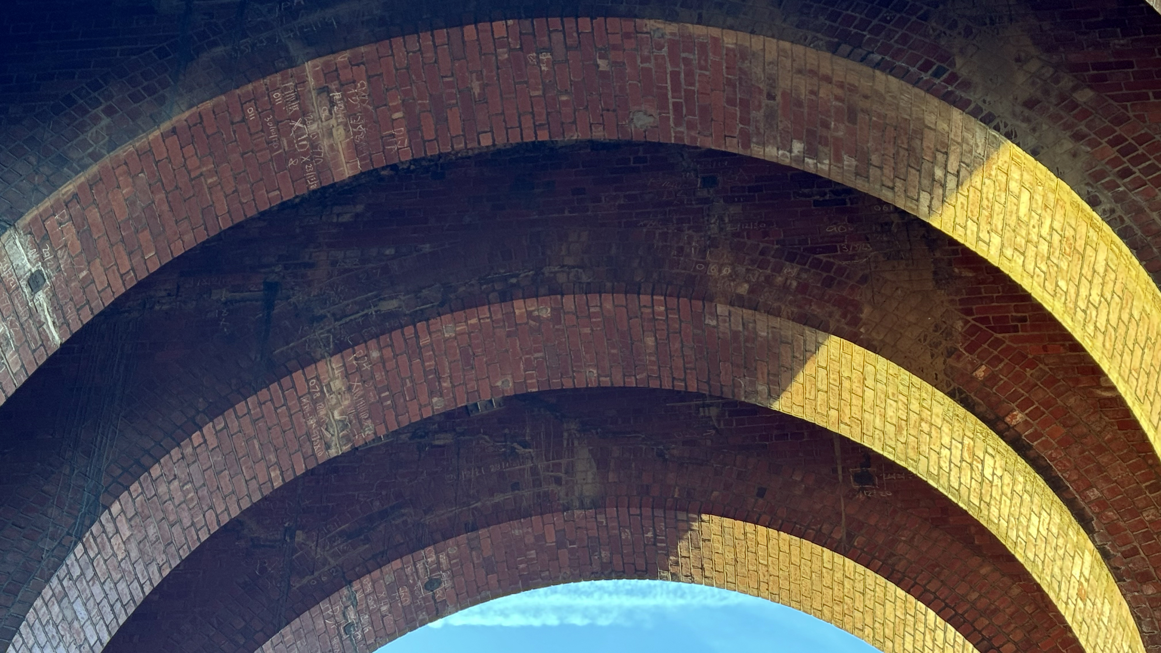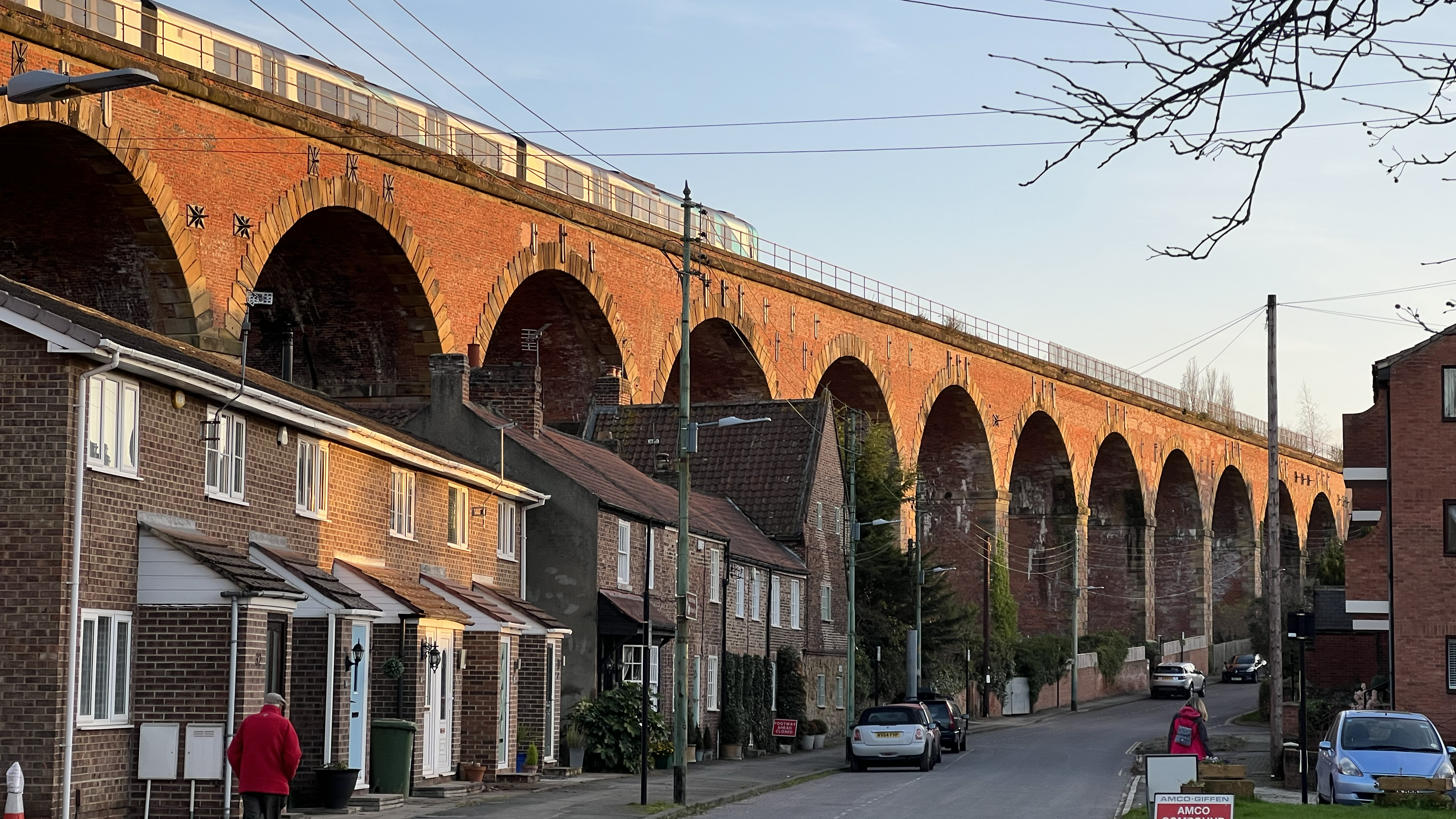 The 172-year-old structure carries trains overhead for practically the whole length of the town, but it is nestled in between Yarm’s narrow terraces so the viaduct’s scale isn’t ever entirely seen from street level.