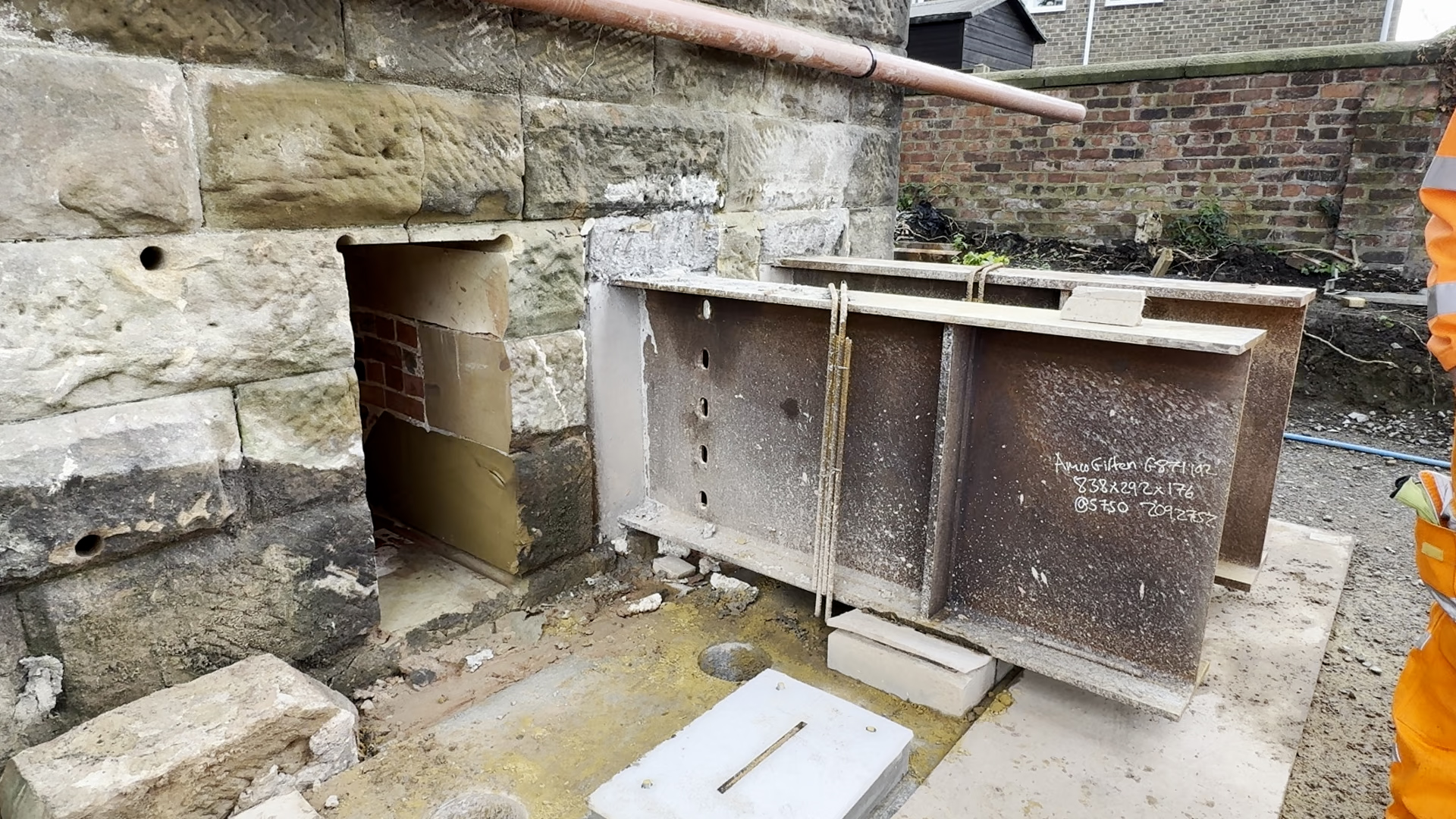 A series of holes were cut through the bottom of each pier inside which steel beams were pushed horizontally, leaving some steel poking out at each end.