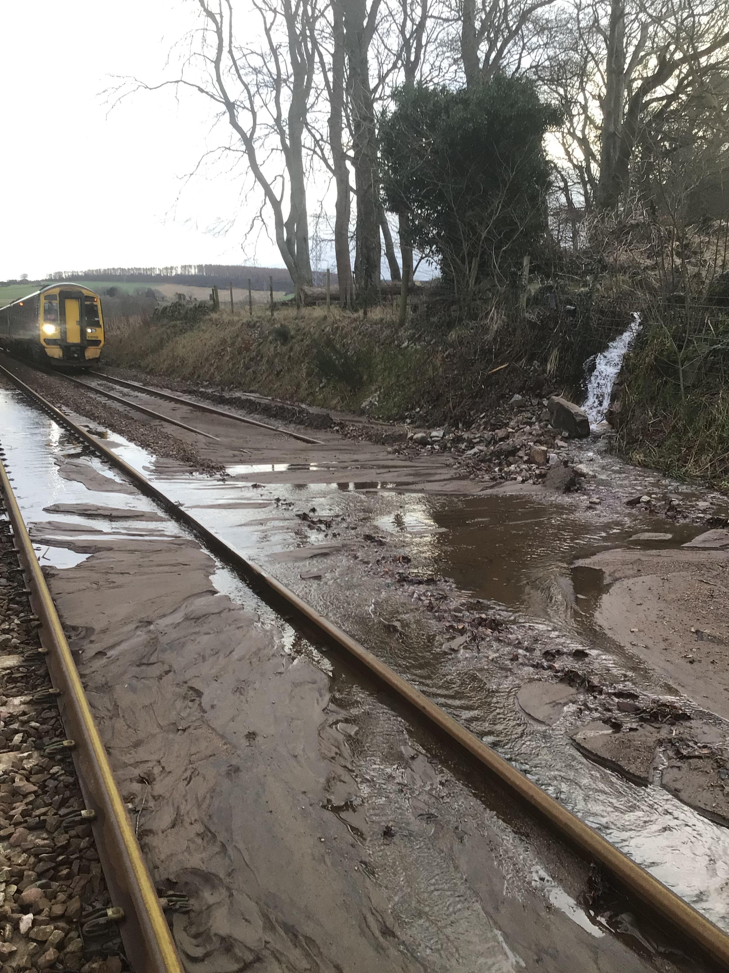 Water has been discovered flowing quickly on to the track at Kirkton of Kinellar, near Dyce in Aberdeenshire, with teams working to divert the water and remove a significant amount of silt before trains services can resume.
