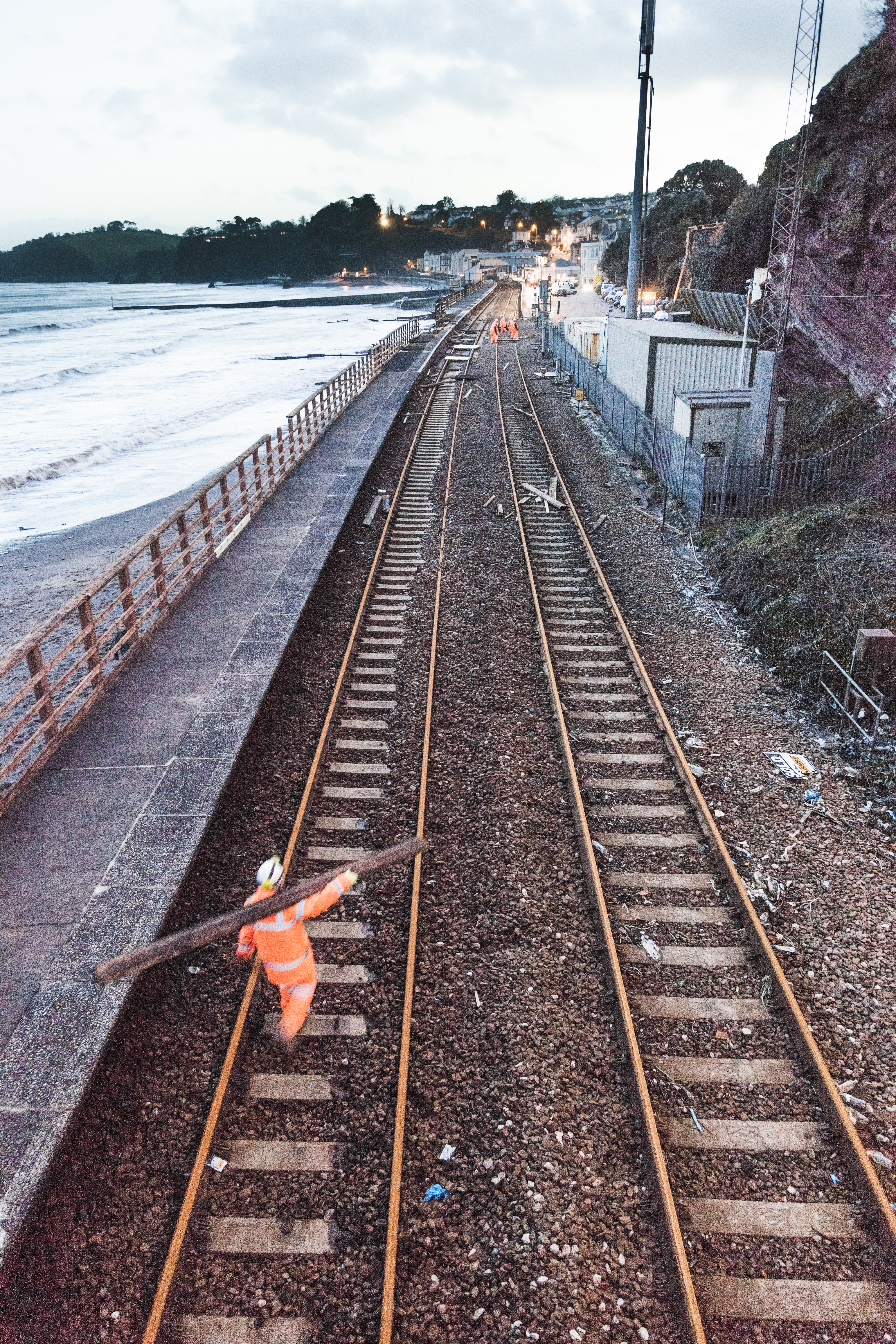 Wednesday, 5 February – Engineers on site at first light but unable to inspect the line due to contiuning storm conditions. Teams of engineers, contractors and suppliers mobilised and head to Dawlish. Work begins on site compound to store machinery to shore up damage, including spray-concrete equipment.