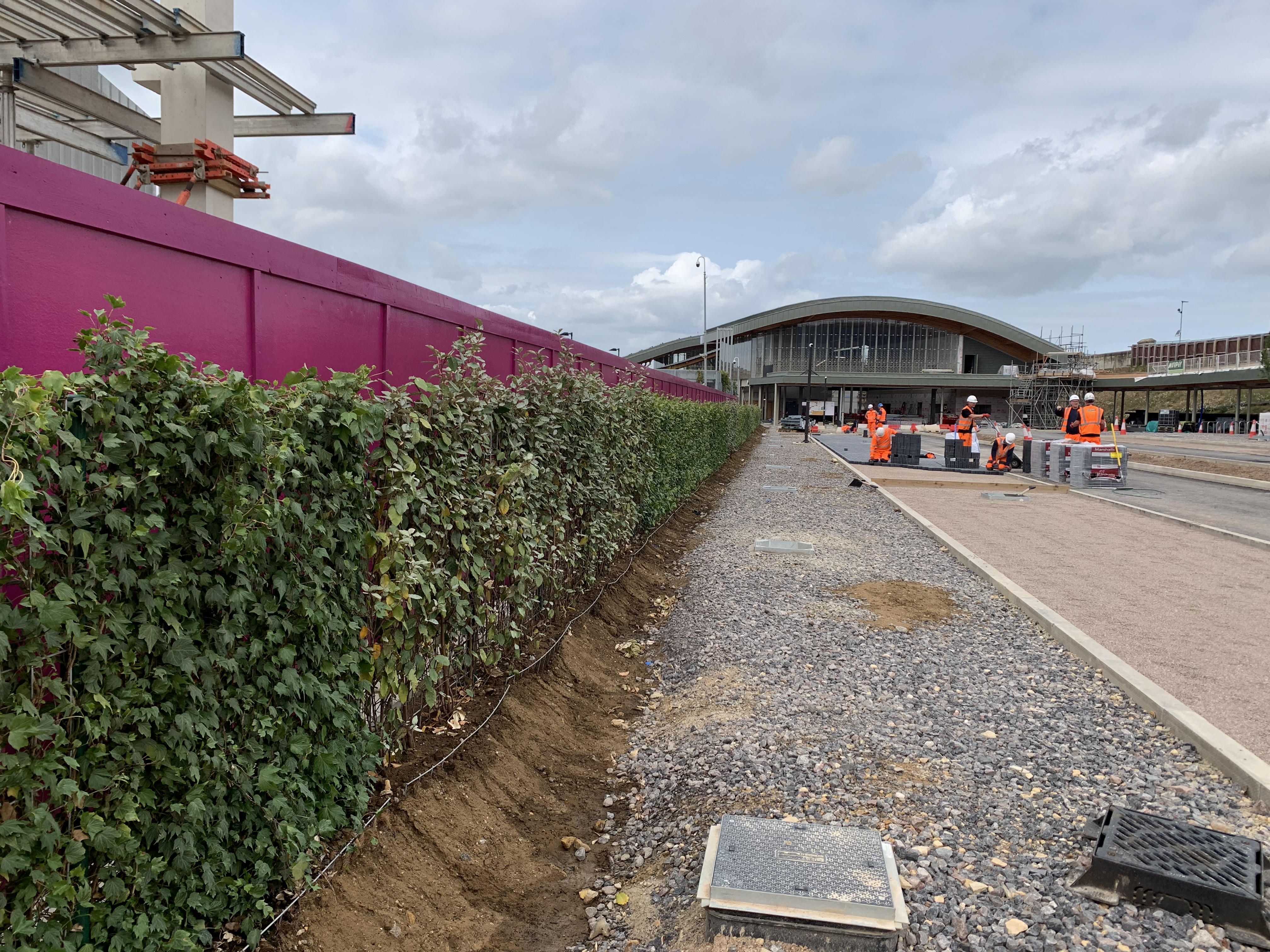 The station’s main forecourt will provide a pleasant environment for station users, with broad leafed tree walkways between Francis Crick Avenue and the eastern station entrance, and a rain garden built into the central reservation of the forecourt’s road system. A living fence along the station’s boundary line adjacent to the neighbouring campus building will add to the overall green environment.