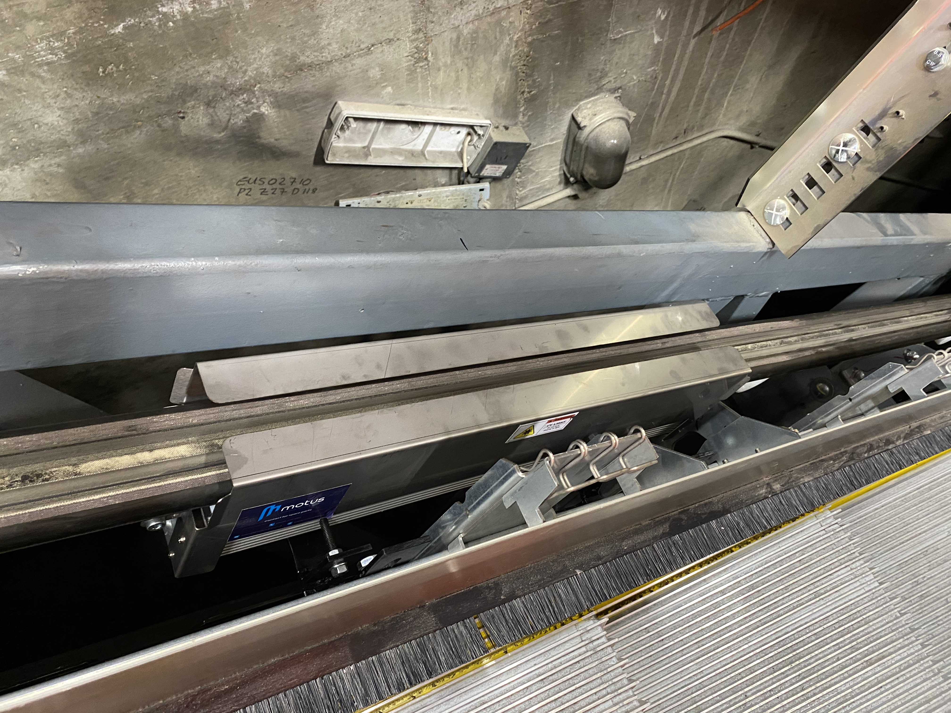 The kit inside the escalator shines powerful ultra-violet (UV-C) light onto the handrail surface.