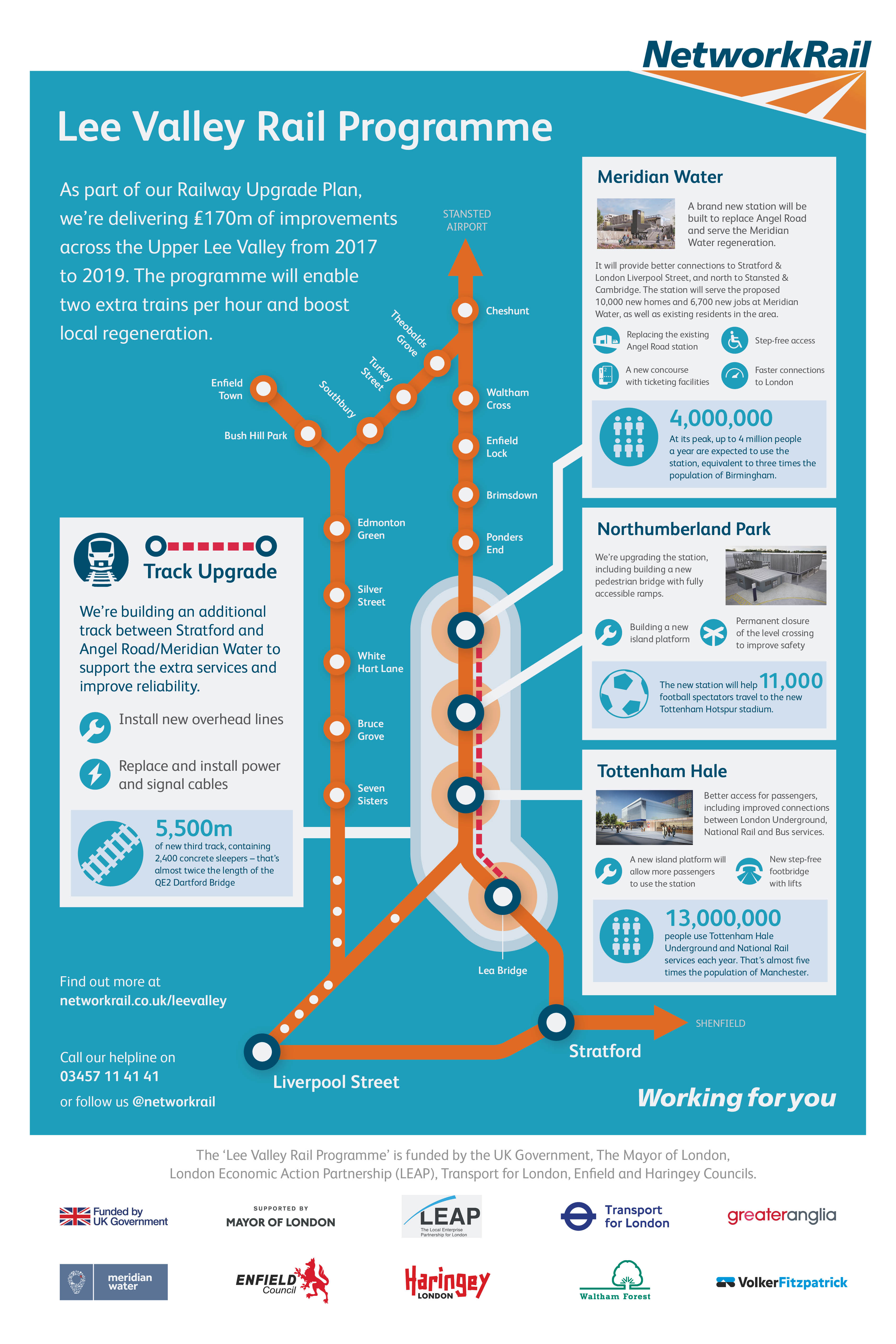 UK Government, LEAP, the Mayor of London, Transport for London, local authorities and Network Rail are working together to deliver benefits in the north London corridor which will improve rail services and maximise economic growth, jobs and housing opportunities. The plans will increase rail capacity on the West Anglia Main Line and accommodate proposed plans for Crossrail 2.