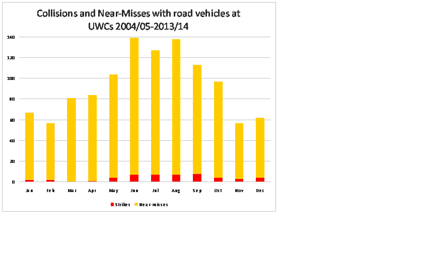 * Figures collated by RSSB (Rail Safety and Standards Board) between 2004 and 2013 and split by calendar month to obtain an annual seasonality average reveal a marked increase in collisions and near misses at User Worked Crossings (UWCs) over the harvest months.
