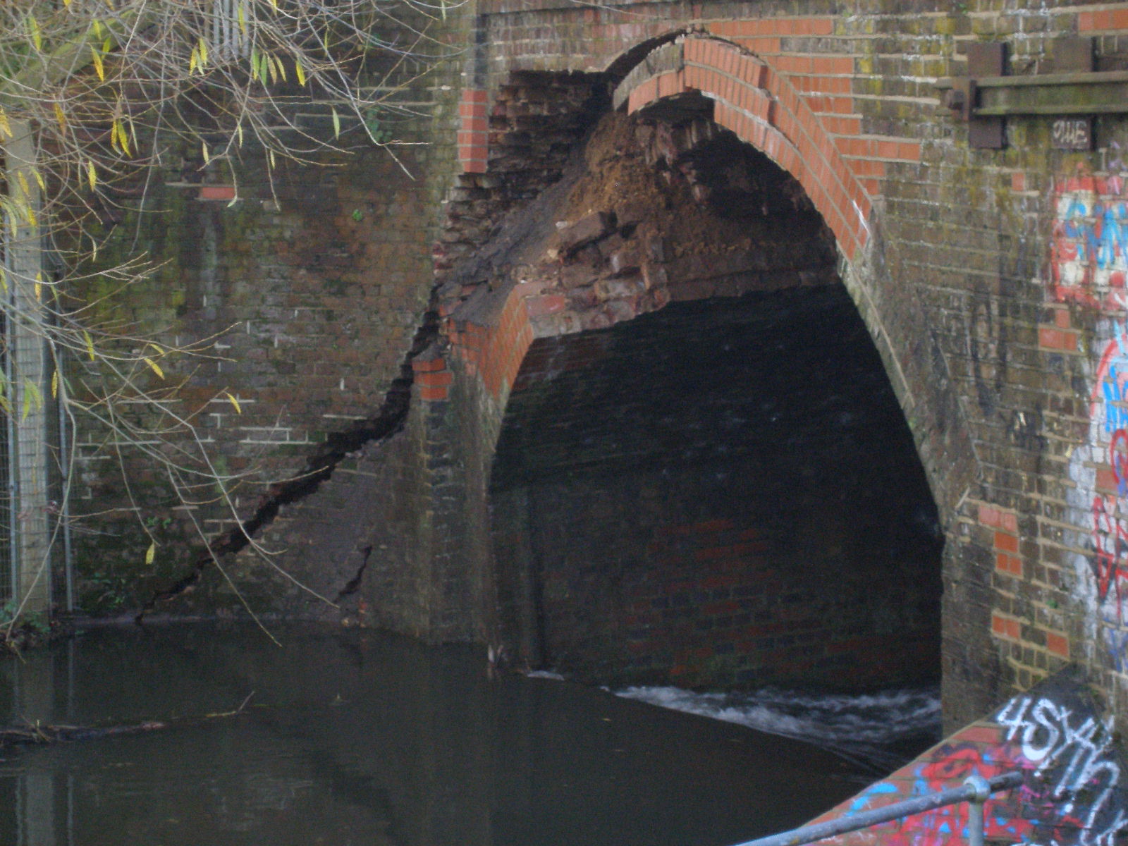 The main arch of the bridge was damaged after prolonged and intense rainfall caused the River Crane to swell. The increased speed and turbulence of the water washed away some of the foundations of the 100-year-old bridge, causing part of brickwork to be dislodged. Network Rail, in line with standard procedures, will carry out an investigation to establish whether there were any other factors which contributed to the damage caused to the arch.