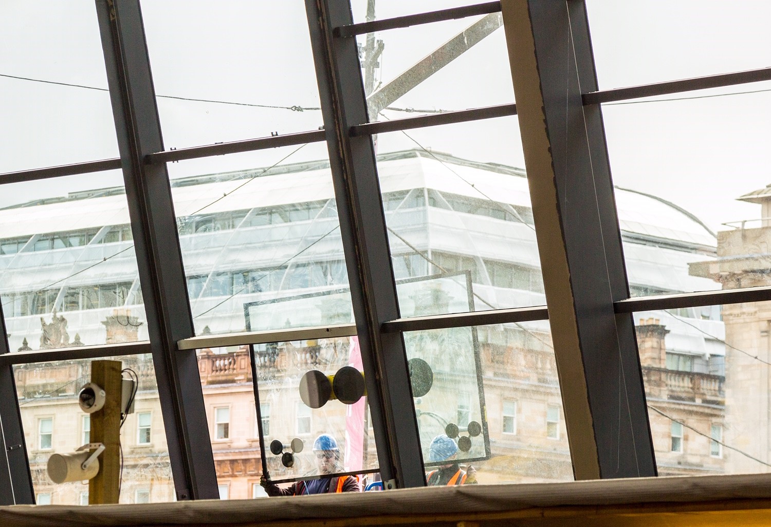 Engineers have completed work to install the 310 glass panels on Glasgow Queen Street station’s new frontage.
