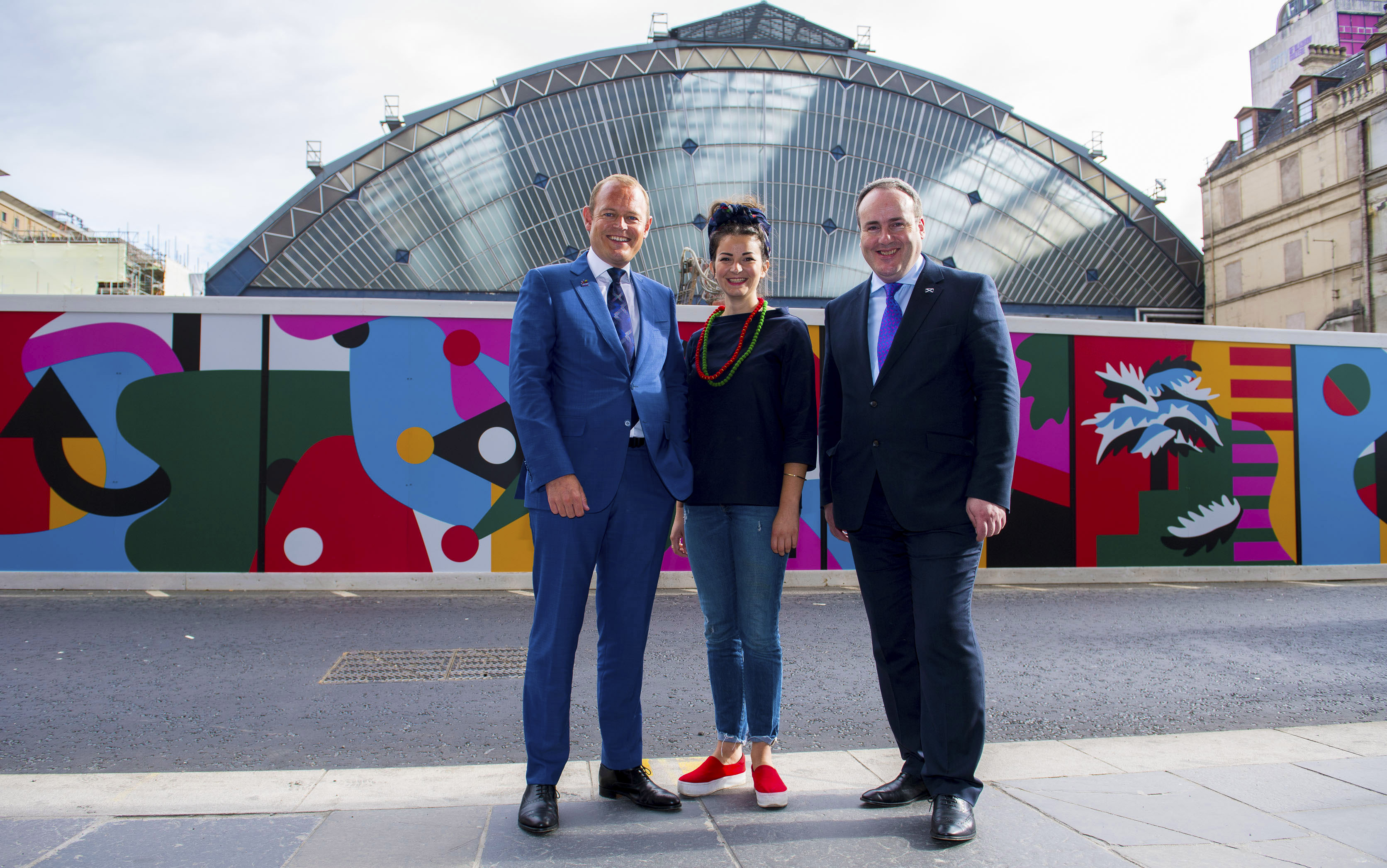 Facing onto Glasgow’s main civic square, the hoarding artwork will also provide a striking backdrop for the European Championships being held in Glasgow. George Square will host a Games Village, while elite international cyclists will race past Glasgow Queen Street during the cycling events.
