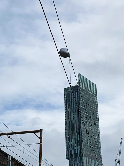 The foil balloon got caught on the high-voltage overhead wires this morning (Monday 4 October) delaying trains travelling between Manchester Oxford Road and Warrington Central.