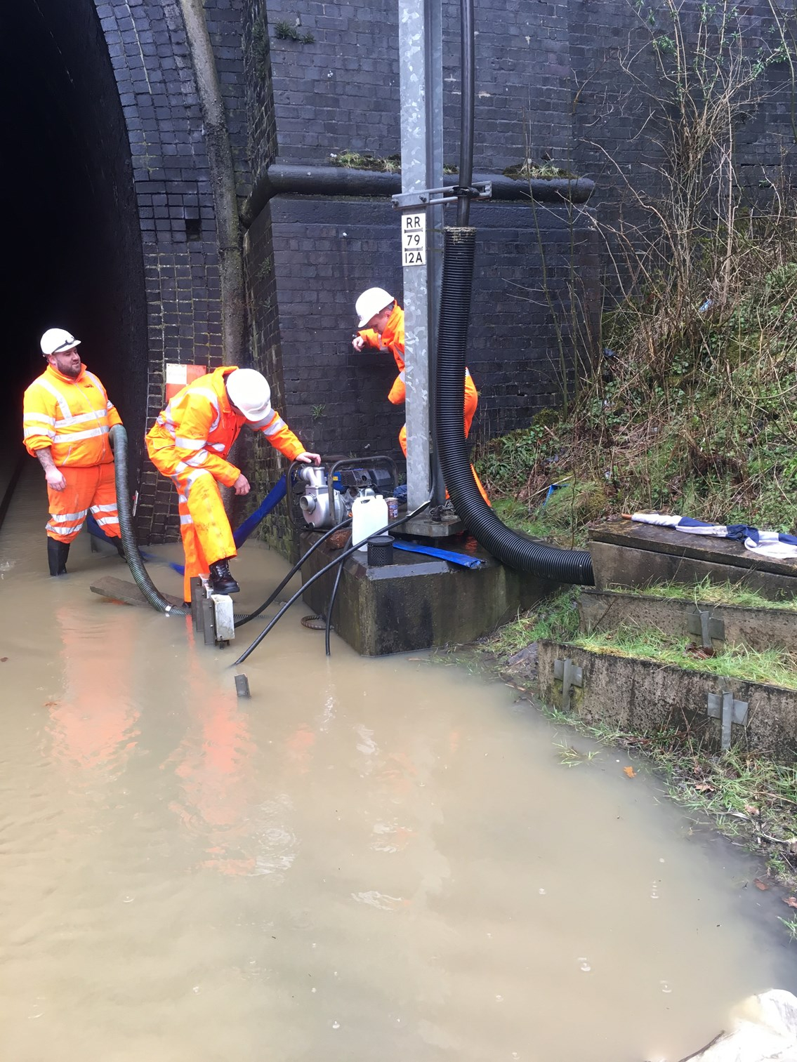 Video released today (Wednesday 10 March) shows how track workers used high volume pumps to clear rising water from tracks last December.