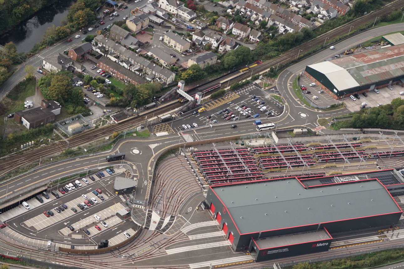Image: An aerial shot of the Transport for Wales Metro depot in Taff's Well. Credit - John Bulpin