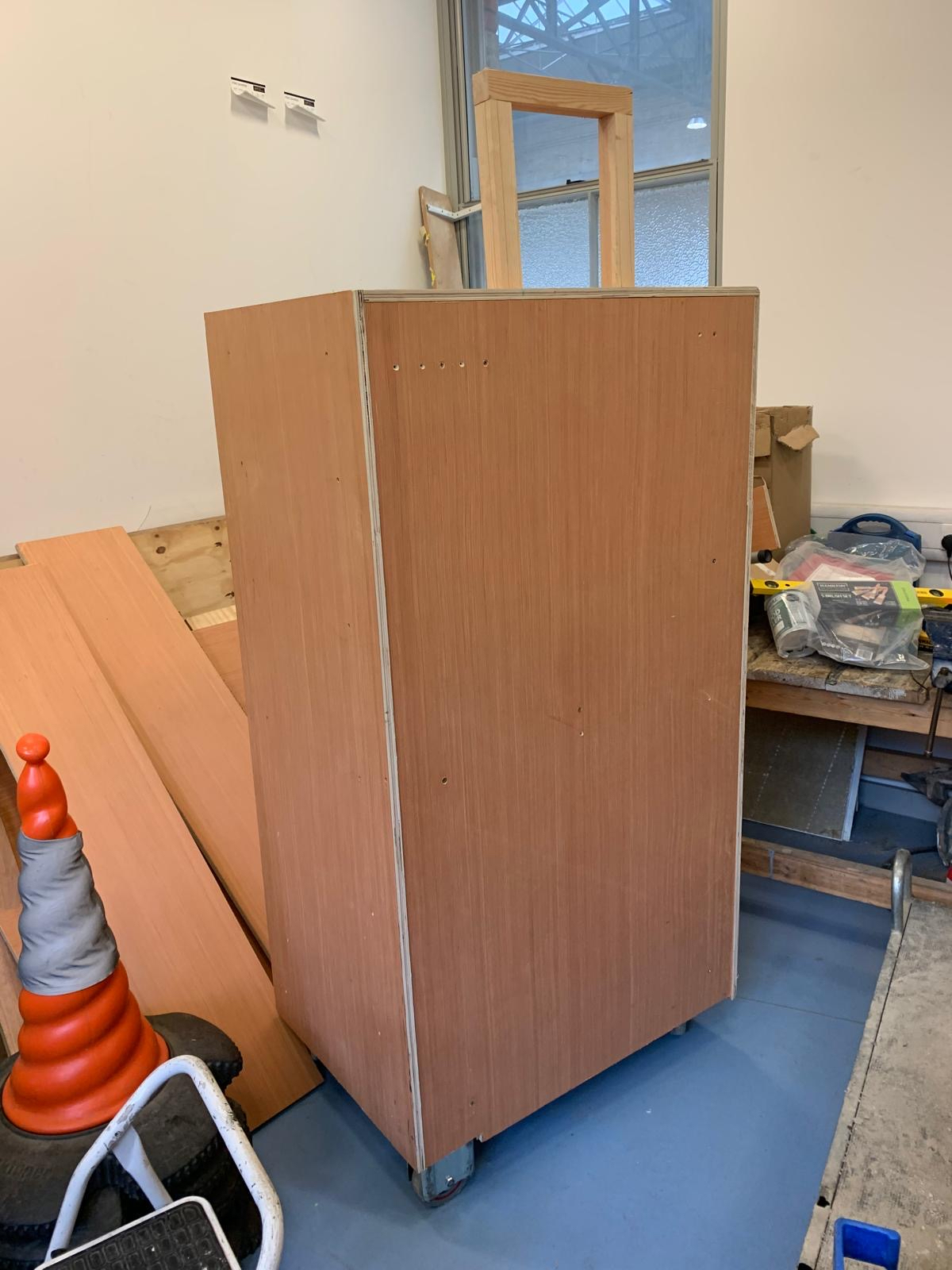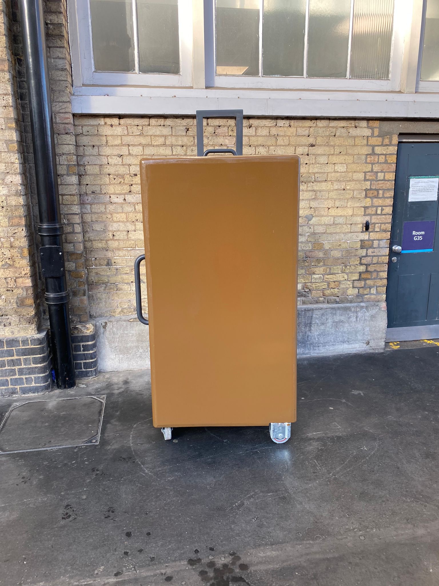 The suitcase, which stands about two metres tall, is fashioned from an old milk trolley encased in plywood and covered in vinyl branding.