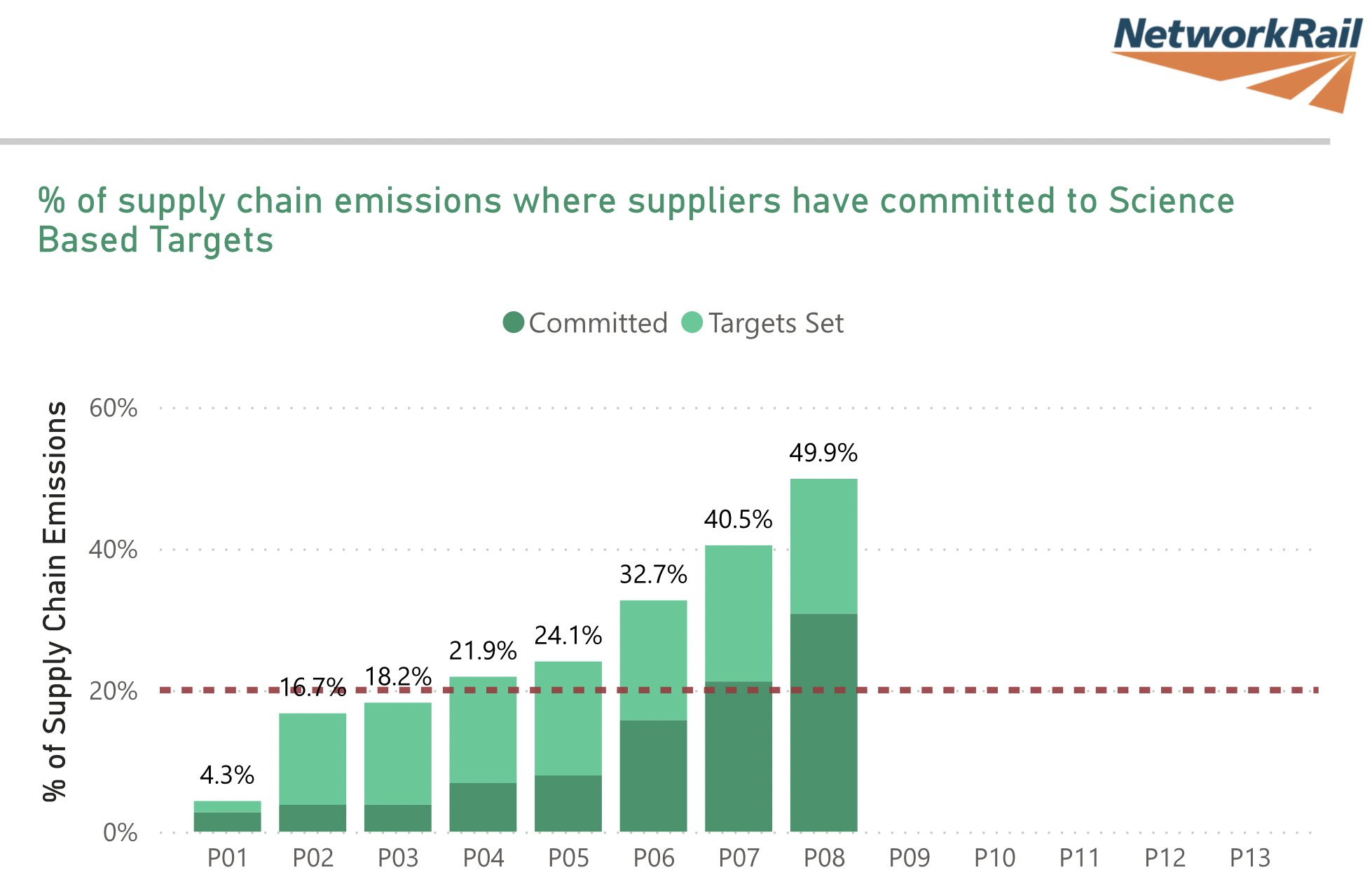 Around 97% of Network Rail's emissions are within 'scope three', meaning emissions largely come from third parties, including suppliers. To address this, Network Rail’s Environmental Sustainability Strategy includes a target for 75% of suppliers to have their own science-based targets by 2025.
