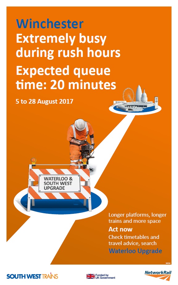Network Rail and South West Trains are today advising passengers in Hampshire to expect waiting times of up to 30 minutes at some stations during the busiest parts of the day, while Network Rail carries out the largest upgrade scheme at Waterloo for decades this August.