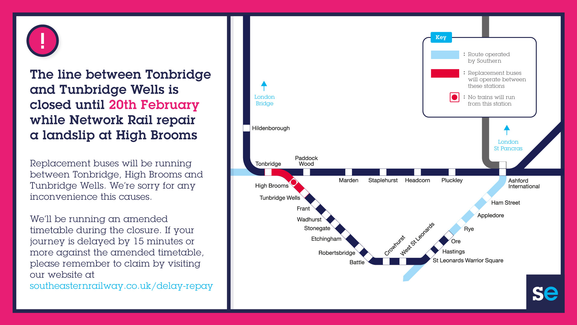“We’ll make sure that changes to journey times and details of replacement bus services are well communicated through our website, National Rail Enquiries, and through our Twitter account @Se_Railway, so please check before you travel.”