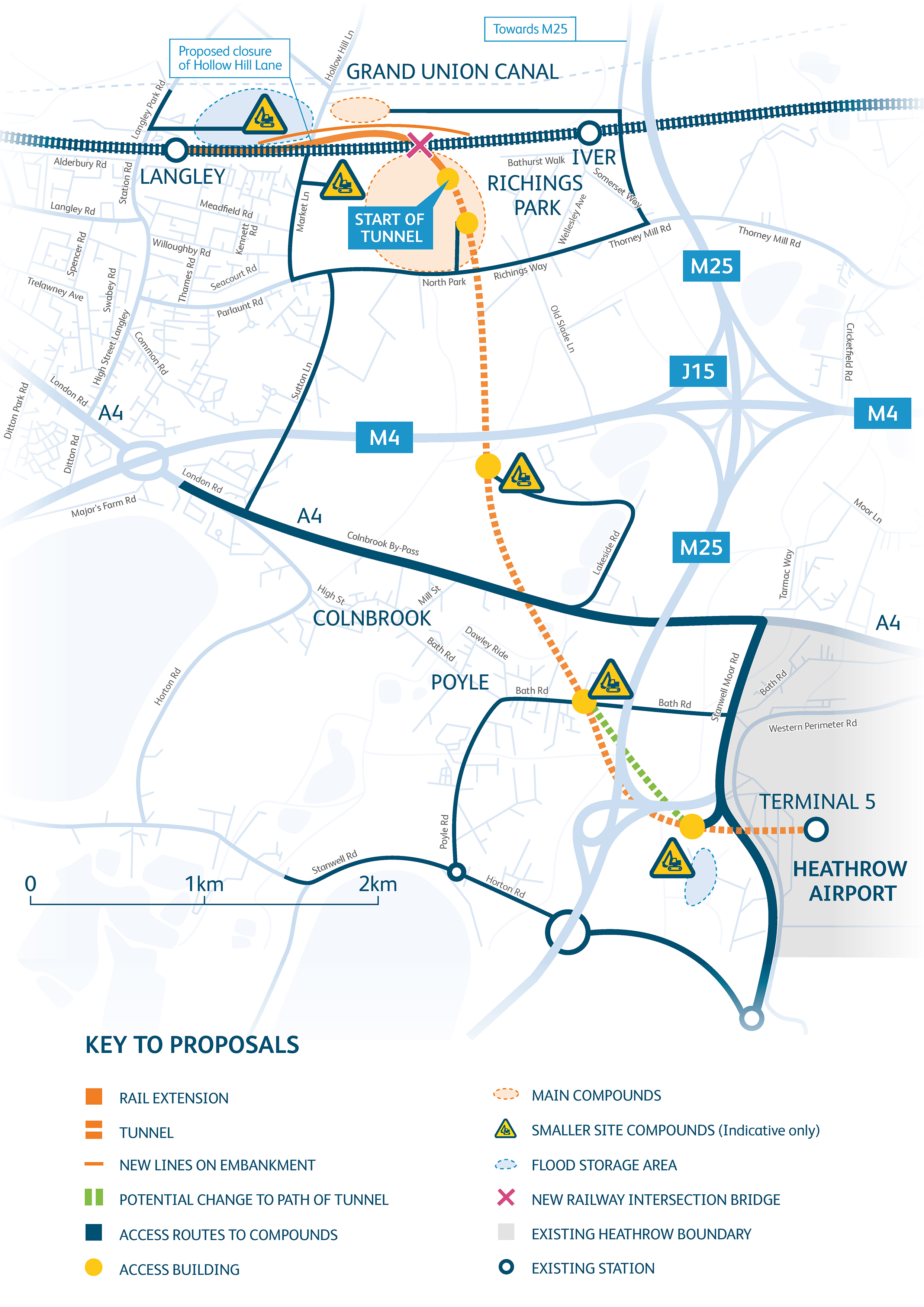 The proposed Western Rail Link to Heathrow would leave the Great Western Main Line between Langley and Iver via a short stretch of open railway before entering a new 5km tunnel. The tunnel would pass under Richings Park and Colnbrook and then join existing rail lines underground at Heathrow Terminal 5.