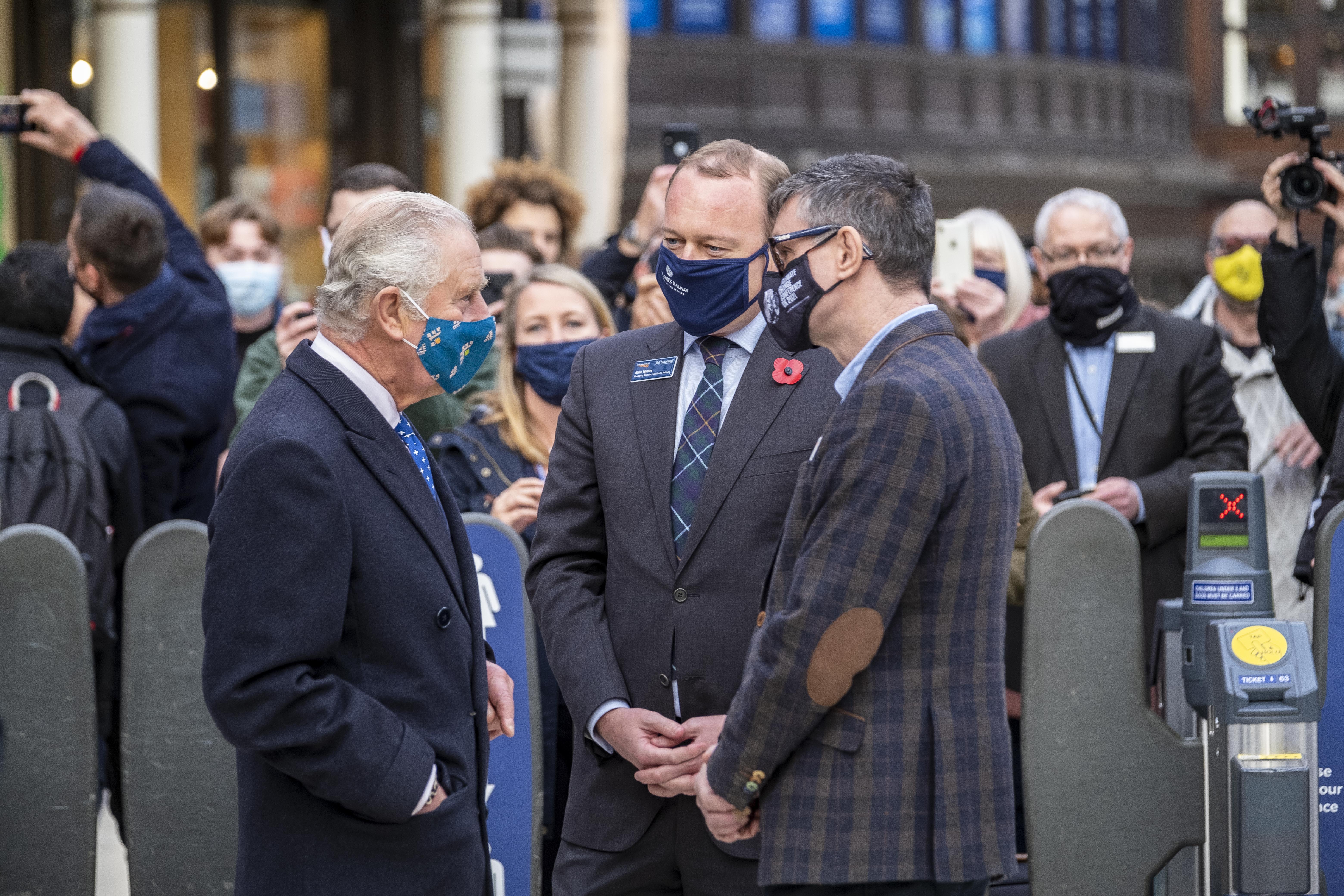 The Prince was welcomed to Glasgow Central station by Network Rail’s station manager, Drew Burns; engineering and safety director Martin Frobisher OBE and Scotland’s Railway managing director Alex Hynes, who spoke with The Prince about Network Rail’s Environmental Sustainability Plan and the measures needed to decarbonise the railway to make a broader contribution to sustainability.