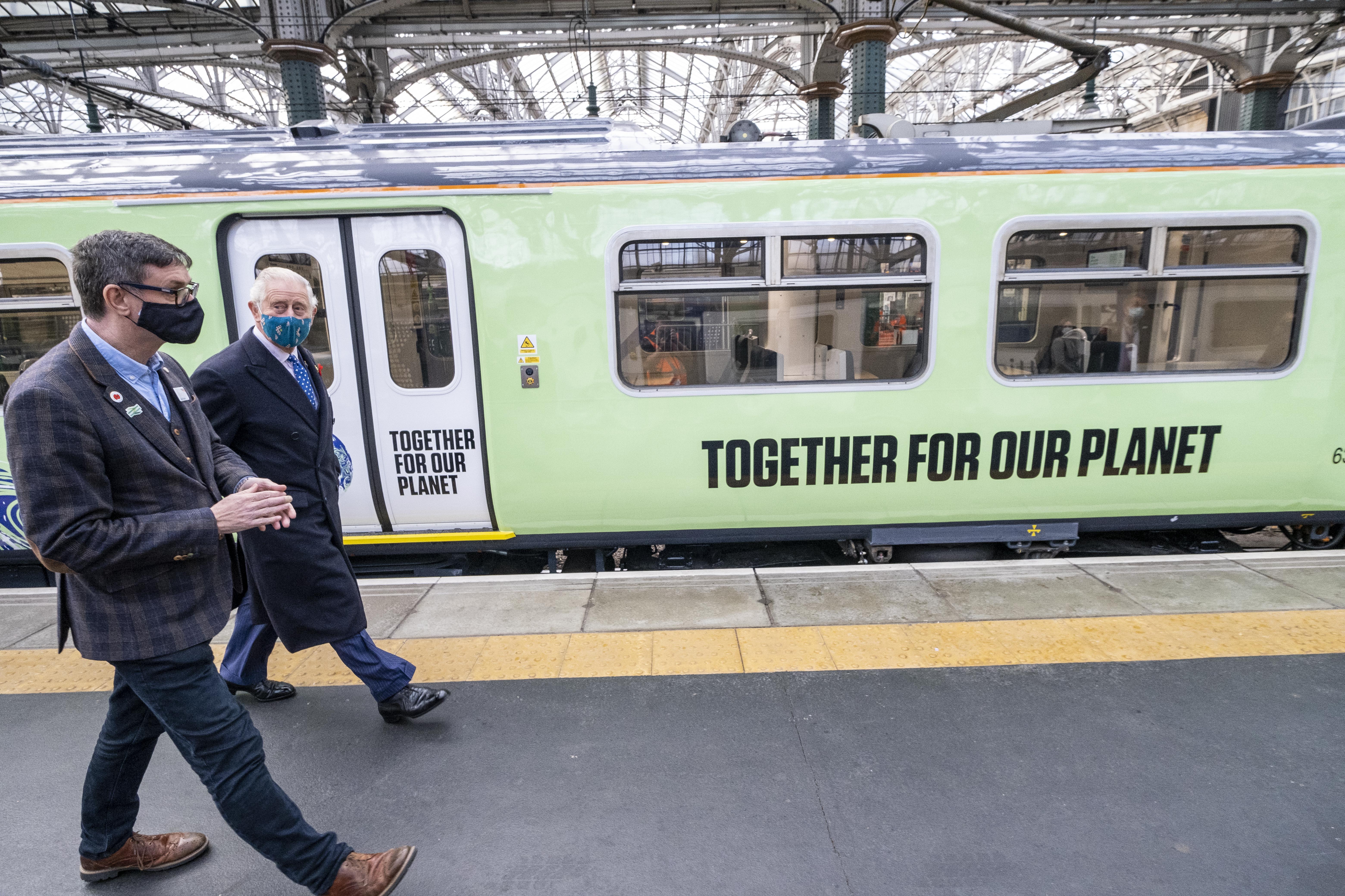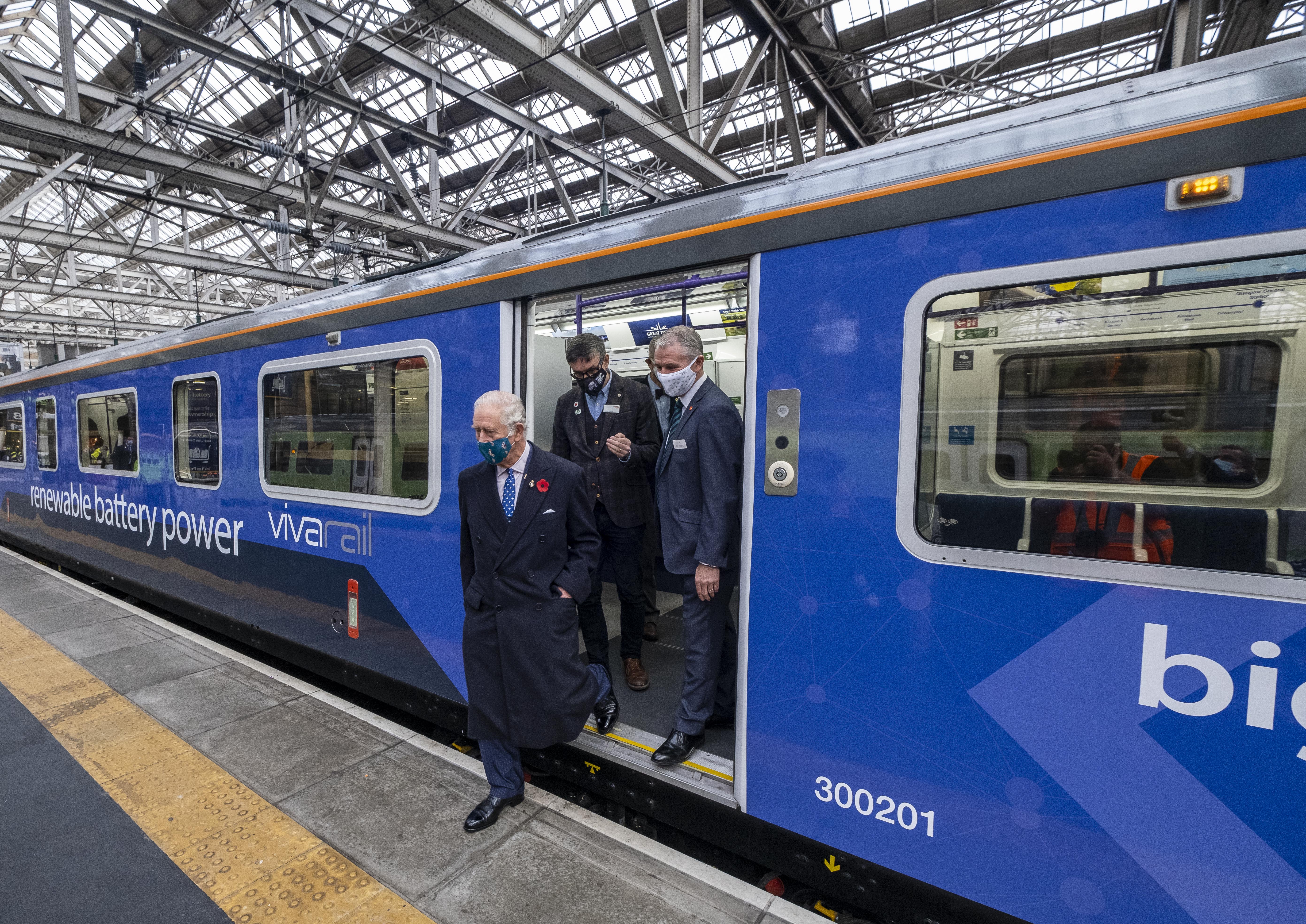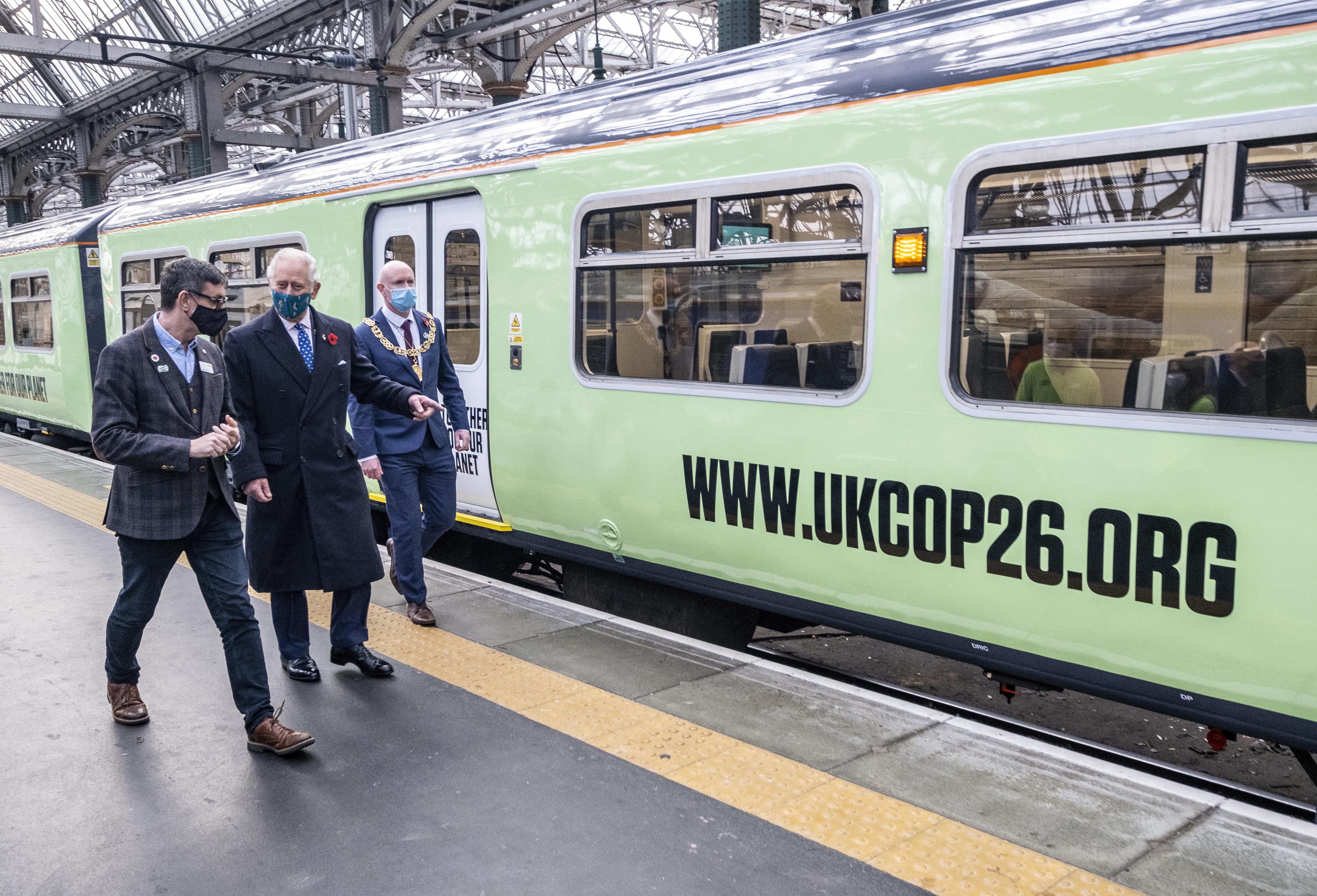 HRH The Prince of Wales steps aboard Britain’s green trains of the future in Glasgow during COP26