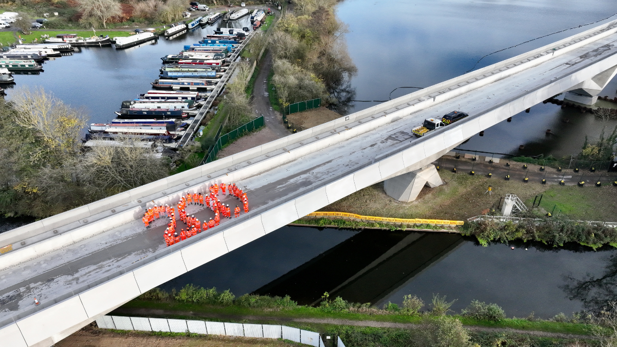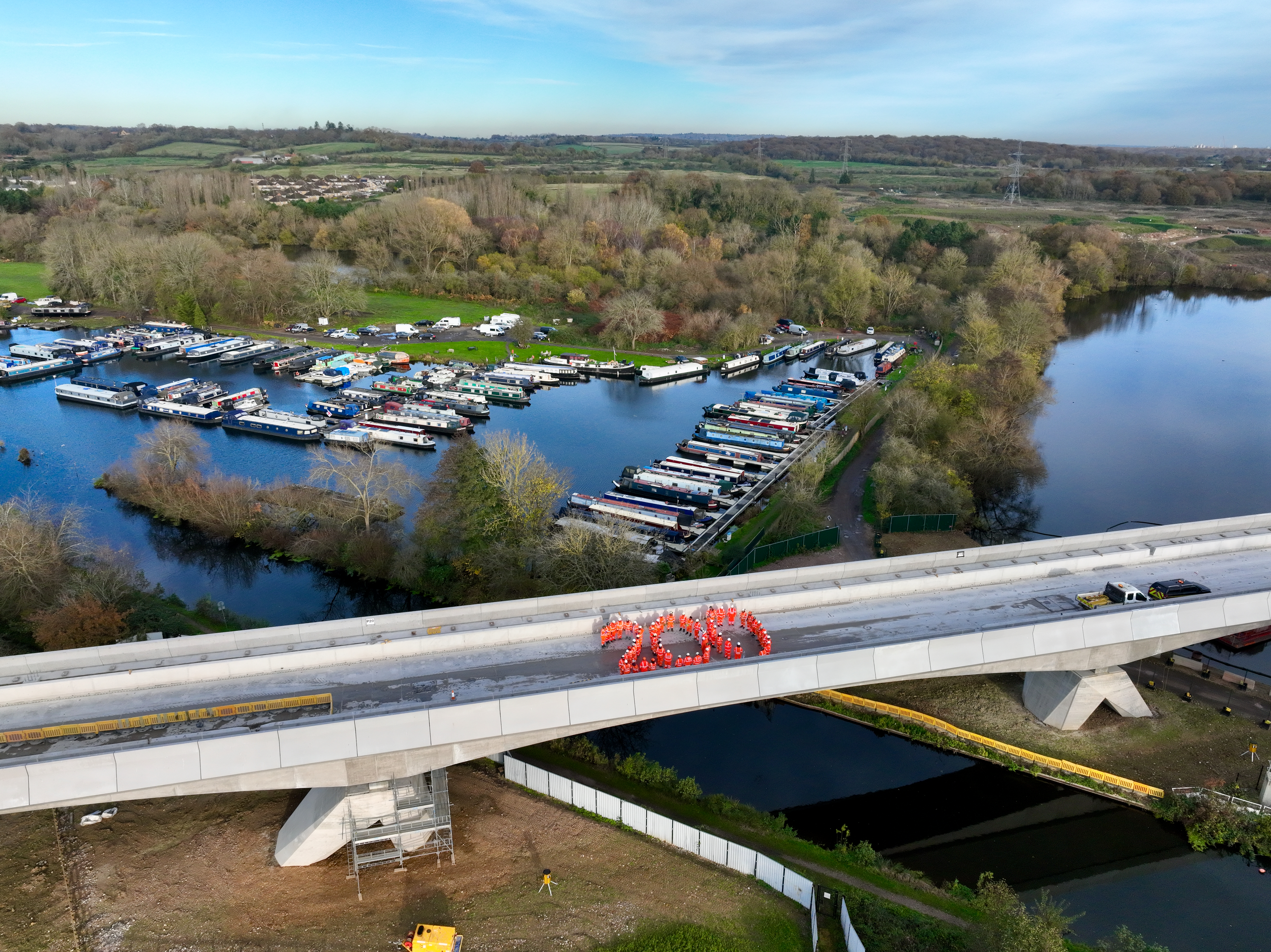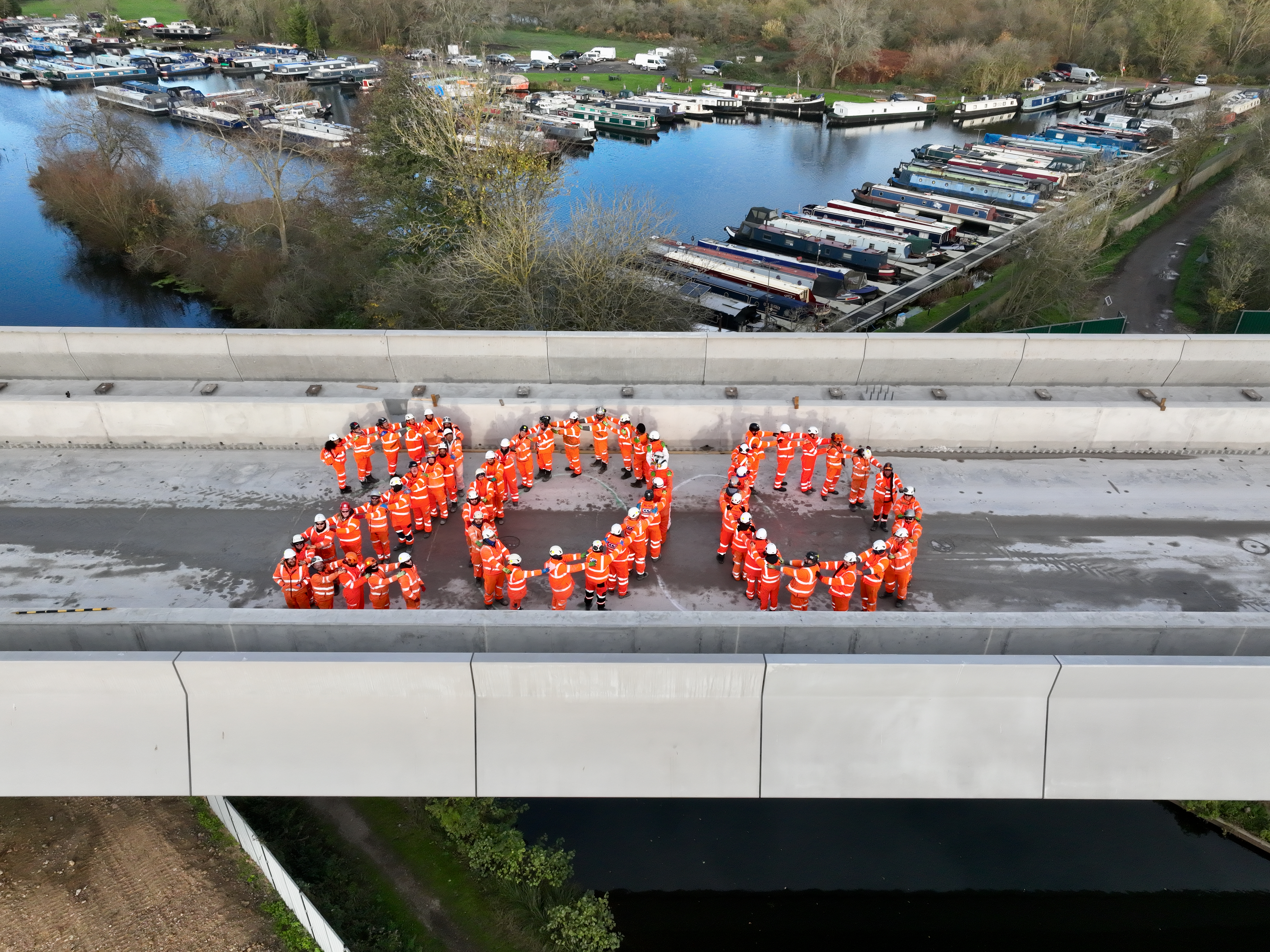 HS2 staff and contractors are pictured here celebrating this national milestone on a newly built section of Colne Valley Viaduct, the longest railway bridge in the UK – almost a kilometre longer than the Forth Bridge in Scotland.
