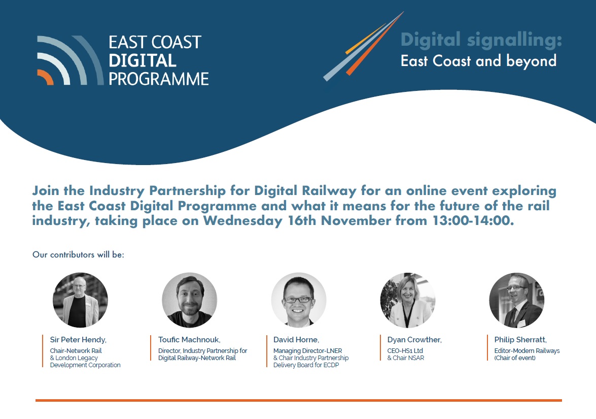 Digital signalling: East Coast and beyond will bring together a panel of industry leaders to consider how the East Coast Digital Programme’s open boundary and user centric industry partnership is generating innovation, and building the capability and experience required for the wider introduction of digital signalling across the network – and for how the railway industry could work better together in Great British Railways.