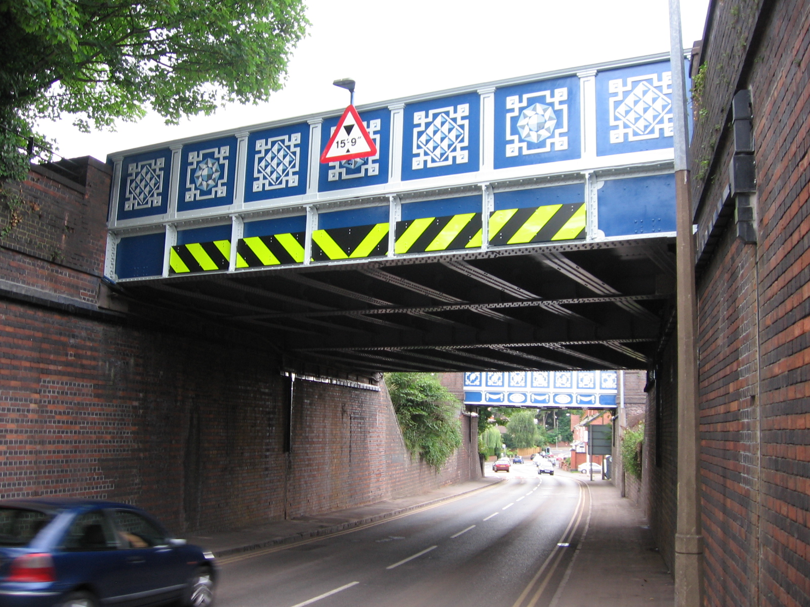 Steve Field, resident artist at Dudley Council was involved with British Rail when the designs were first painted about 20 years ago. Fortunately, Mr Field found and reused the original stencils. The second bridge has designs representing cut glass but the original painting of these was done freehand from small sketches.