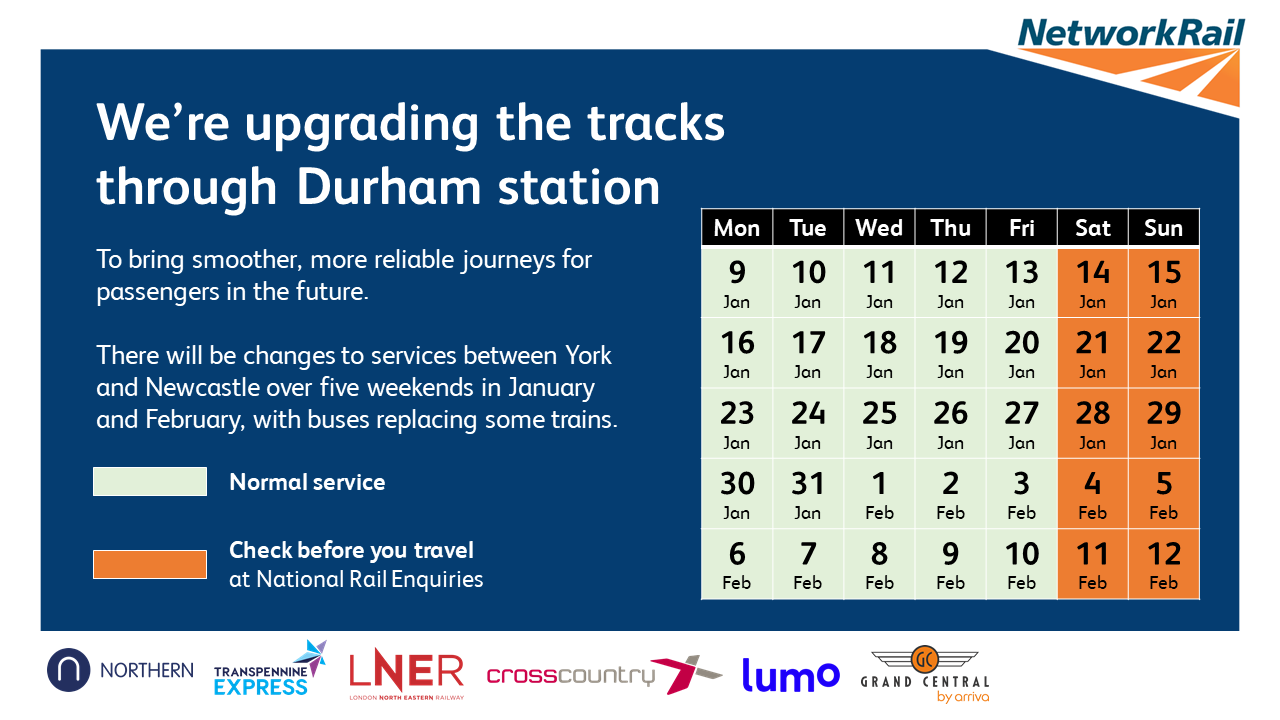 Paul Rutter, Route Director for Network Rail’s East Coast route, said: “The work we’re doing in and around Durham in January and February will help boost reliability and provide smoother journeys for passengers.