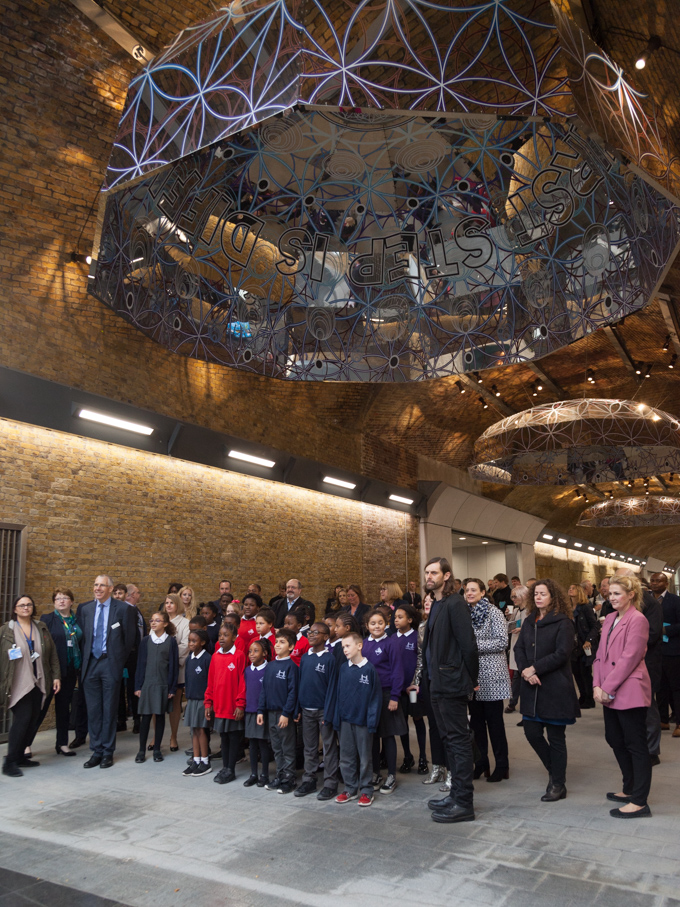 The work comprises of three polished stainless steel domes, measuring from 4.5 to 6.5 metres in diameter, suspended from the ceiling of the northern end of the walkway, and printed on either side of geometric designs with three succinct texts. They offer a mantra to passengers and visitors underneath encouraging a moment of pause and self-reflection, whilst mirroring the brickwork ceiling and the movement of everyday life below.