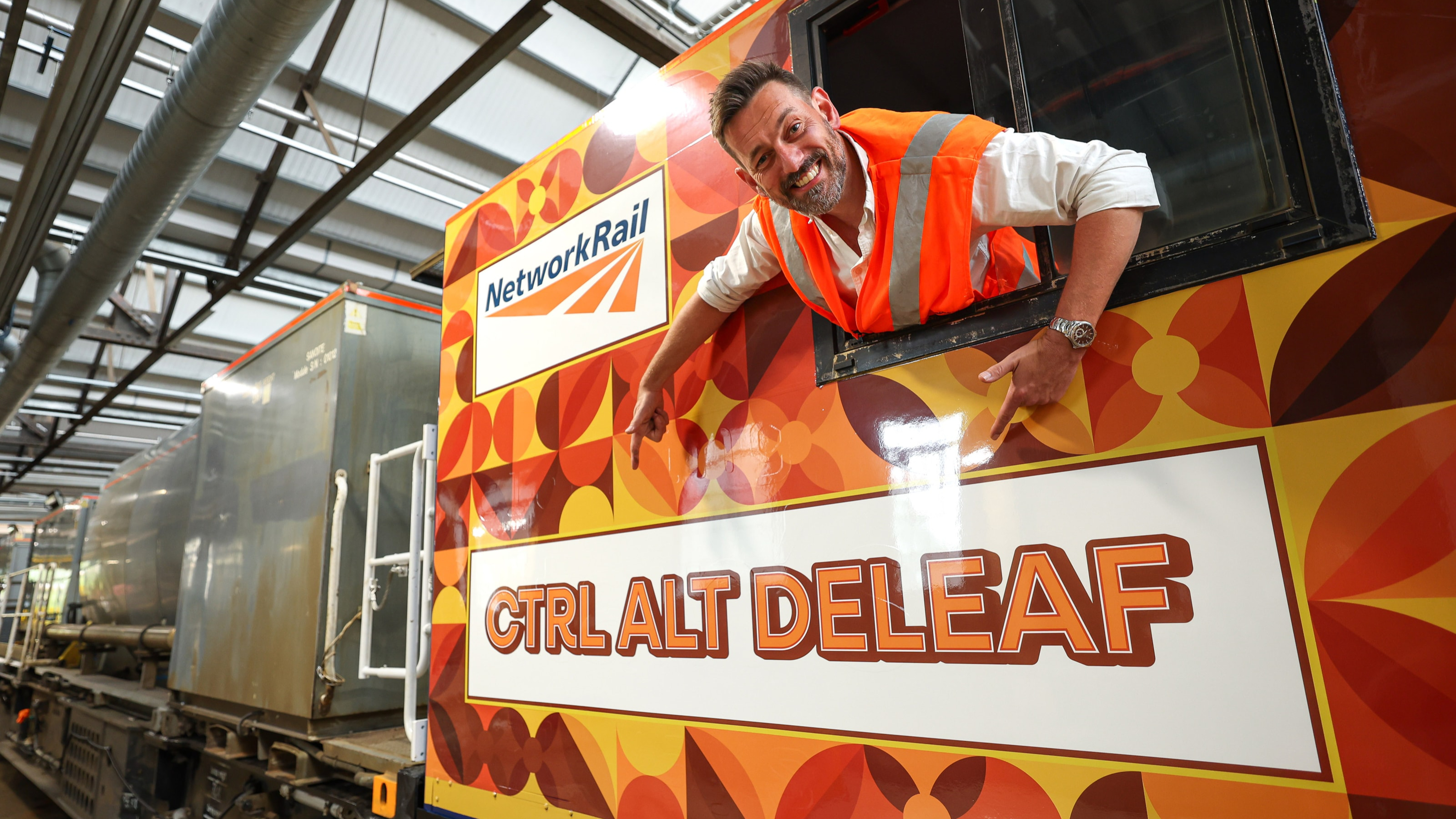 Main picture shows railway historian, author and presenter Tim Dunn unveiling a named 'leafbuster' train - 'CTRL ALT DELEAF'.