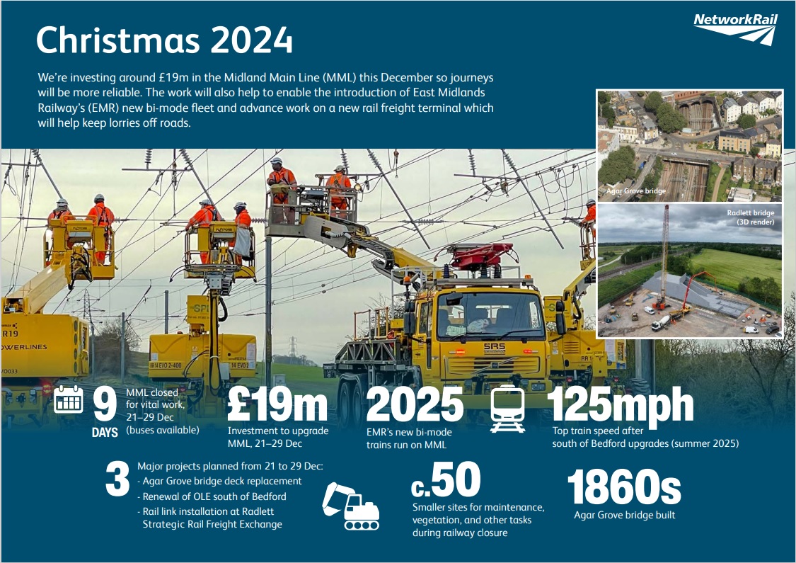 Engineers working on the Agar Grove project which began in May 2024, will replace the full bridge deck on the bridge over the railway near St Pancras. Work will start after the last train on Friday 20 December and the railway will re-open in the early hours of Monday 30 December. No trains can run under the structure while the work is being carried out. Teams will also be continuing work to replace overhead power lines as part of the South of Bedford upgrade. This work will allow all trains, including EMR’s new rolling stick run up to 125mph between St Pancras and Bedford later in 2025.