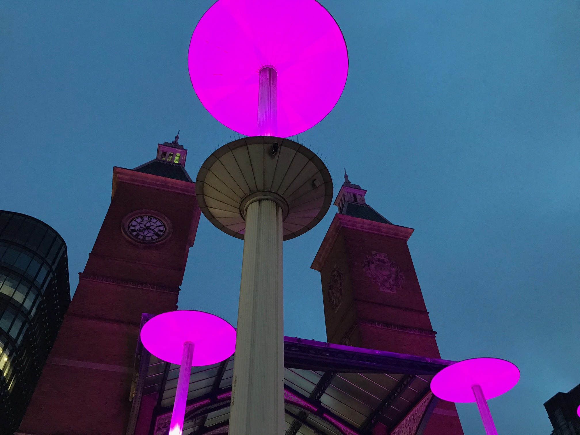 The lights outside one of London Liverpool Street station’s main entrances have been turned purple today, Wednesday 27 January, to mark Holocaust Memorial Day.