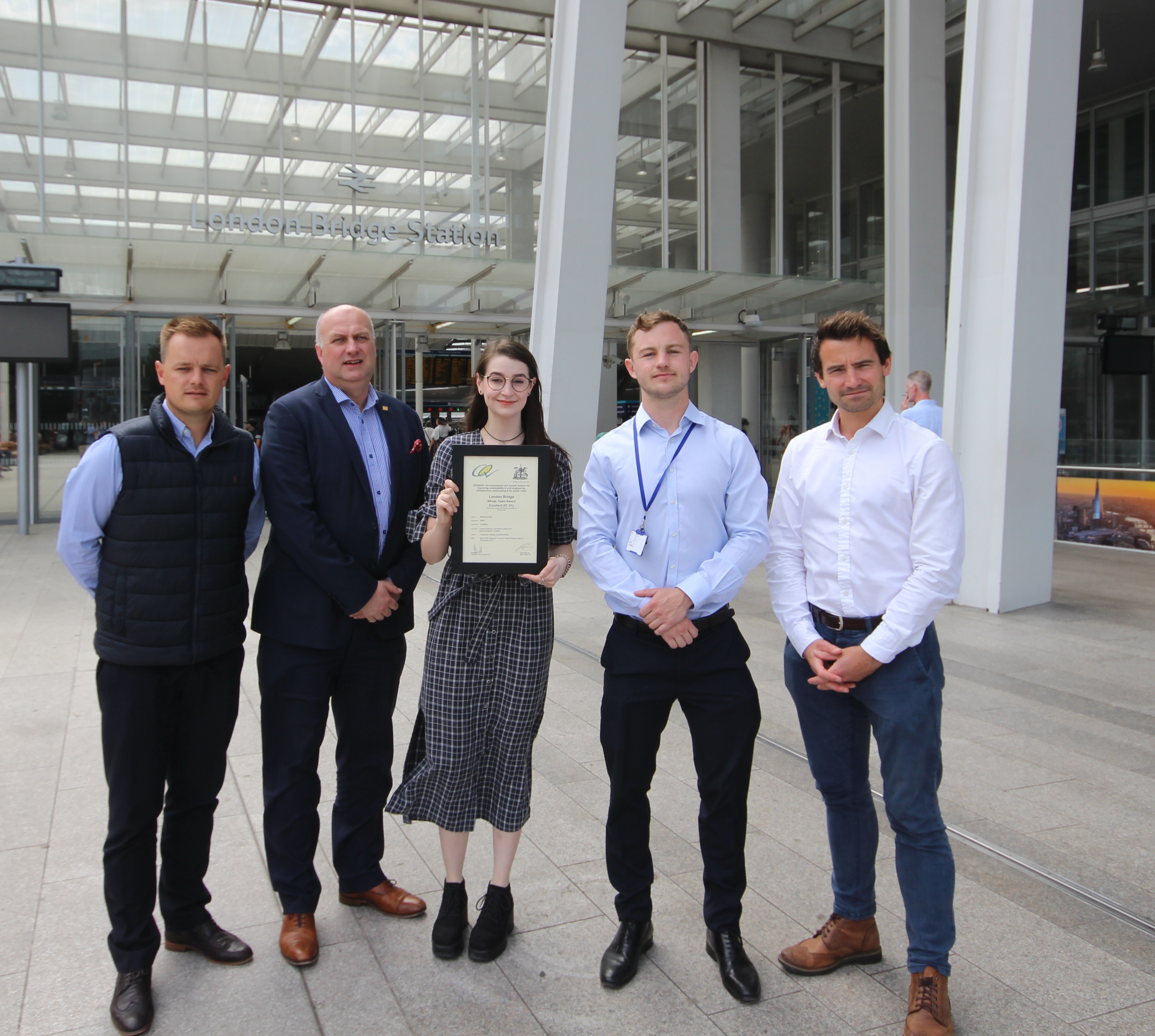Photo left to right: Nick Martin, Thameslink Programme, London Bridge station project manager, Costain ; Ian Nicholson, CEEQUAL; Isabel Simpson,TLP, LBS, Costain, CEEQUAL assessor; Ben Joiner, TLP, LBS, Network Rail project manager; Andy Barnes, Network Rail, consents manager