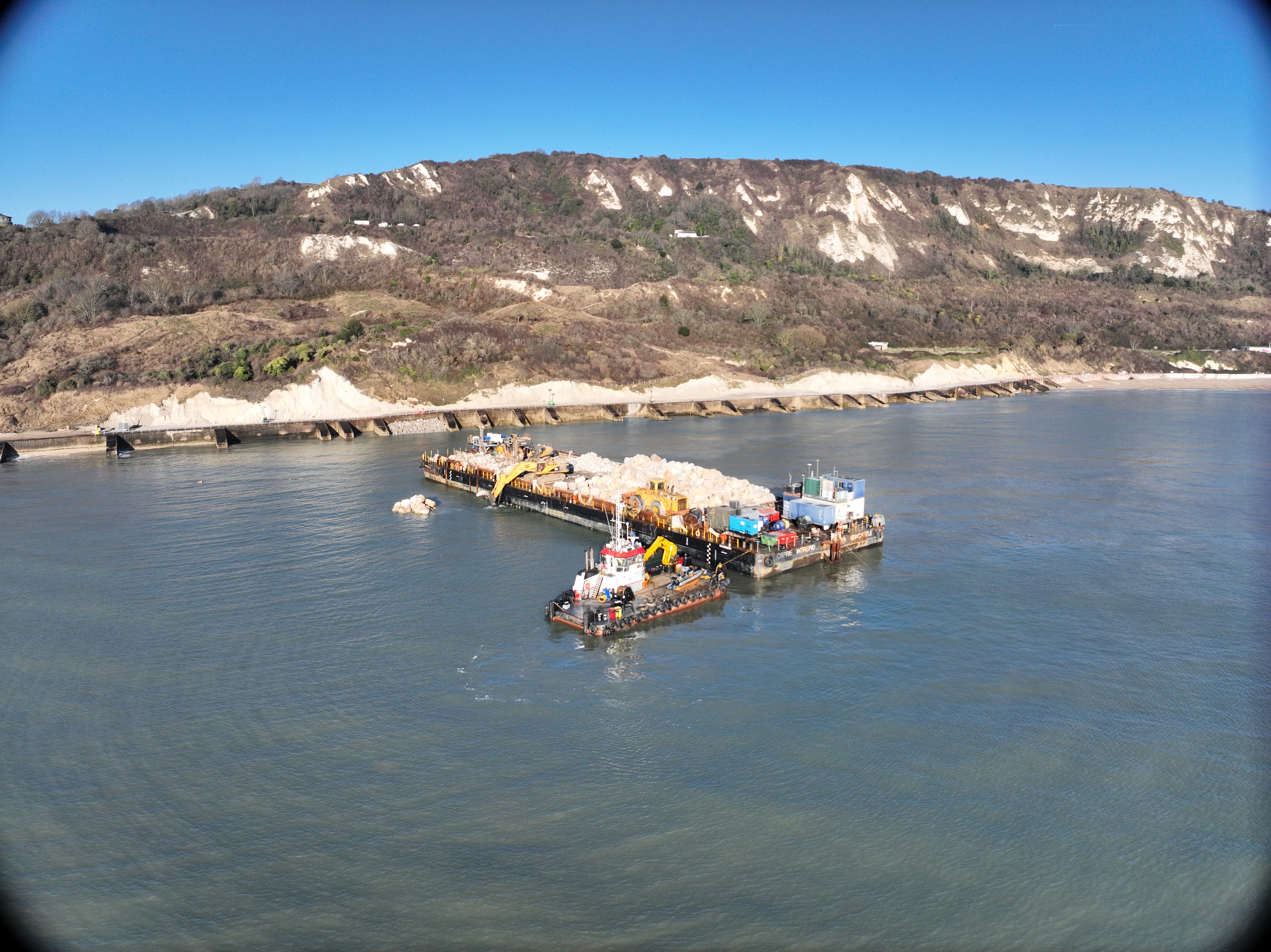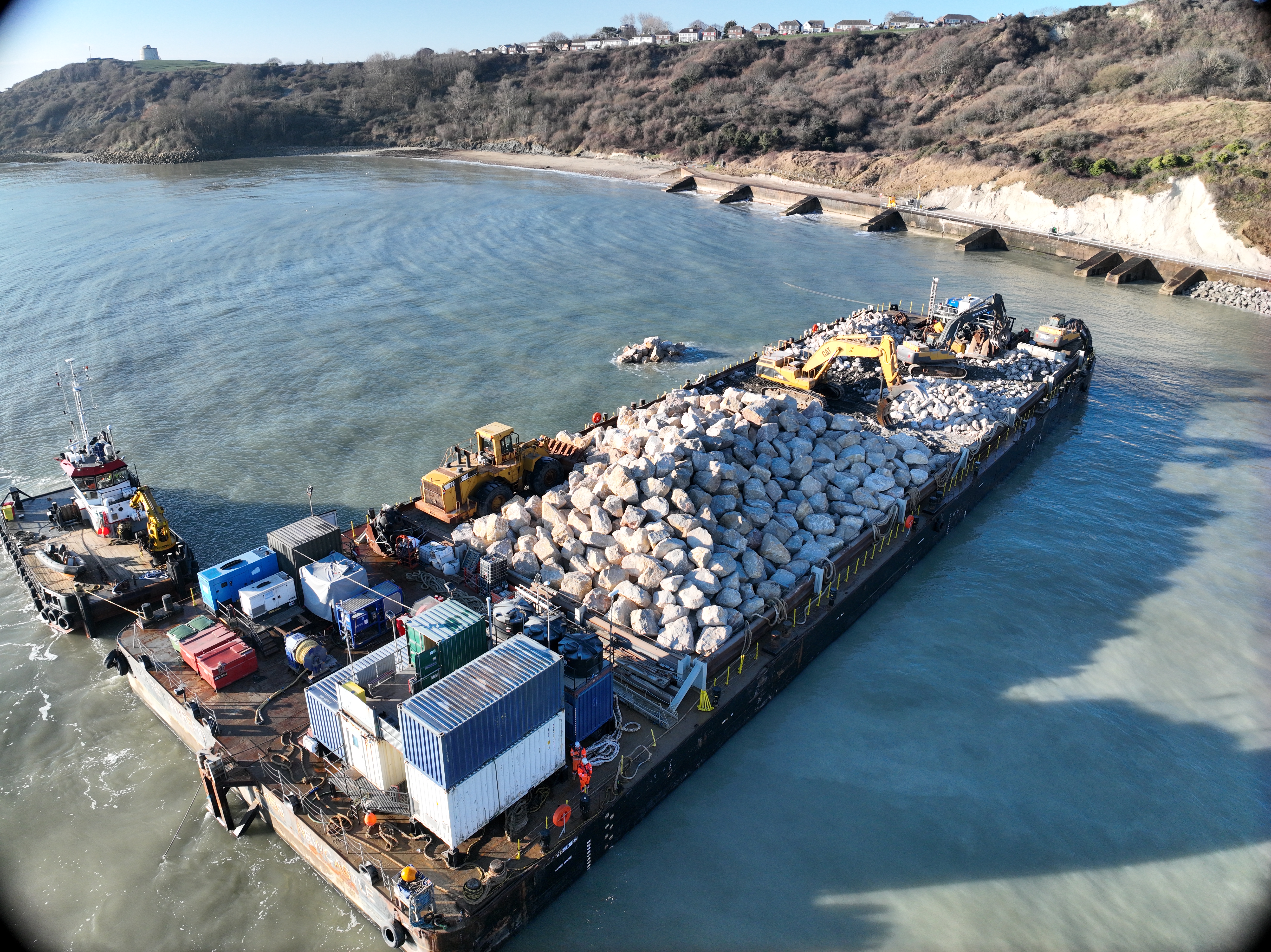 These will now be strategically placed along the beach to shield the coastline from erosion and stabilise the railway and surrounding cliffs for the next 30 years. The rocks will be placed directly on the beach, covering approximately three hundred metres of shoreline. In total 18,000 tonnes of limestone will be used with a further two deliveries subject to weather conditions.