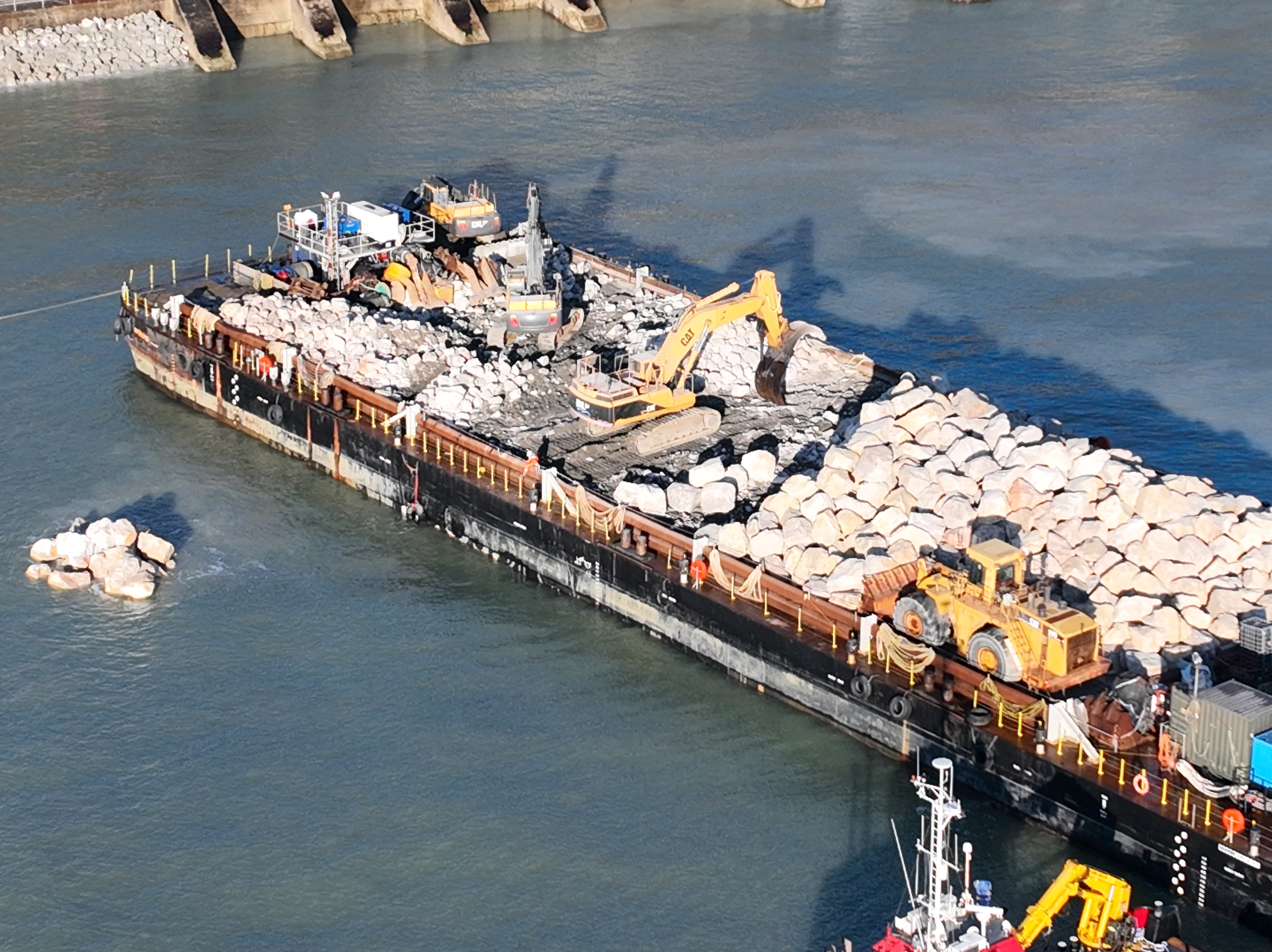 To reinforce the sea defences below the railway, the first of three deliveries of Boulogne Limestone, a tough, crystalline rock that is hard wearing and well suited for use in coastal protection, was delivered today, Monday 5 January 2025, onto the beach.