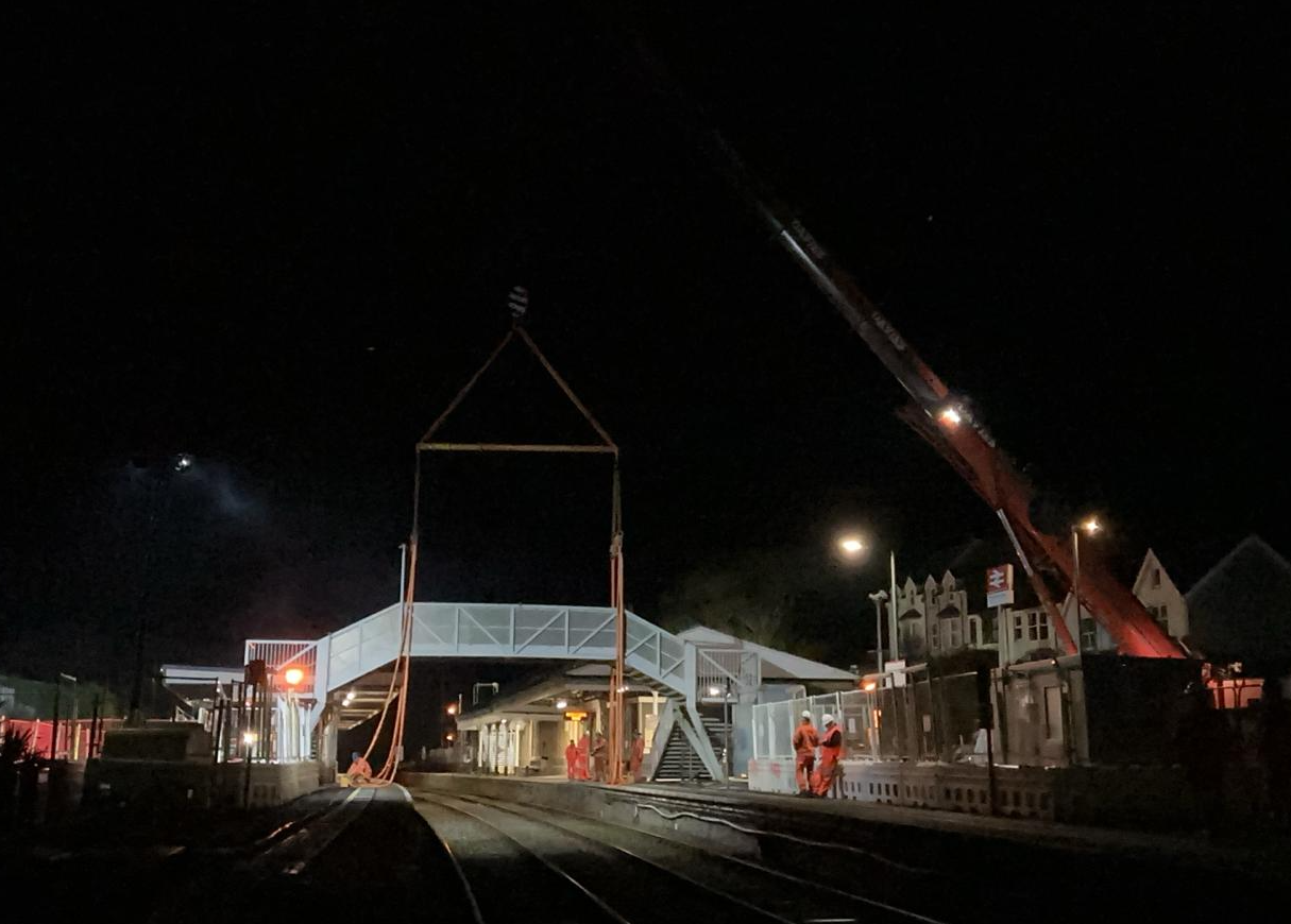 This March, teams safely removed the existing footbridge, using a 220 tonne and 60 tonne crane, and installed a temporary walkway, allowing passengers to continue moving between platforms while construction of the new accessible bridge gets underway.