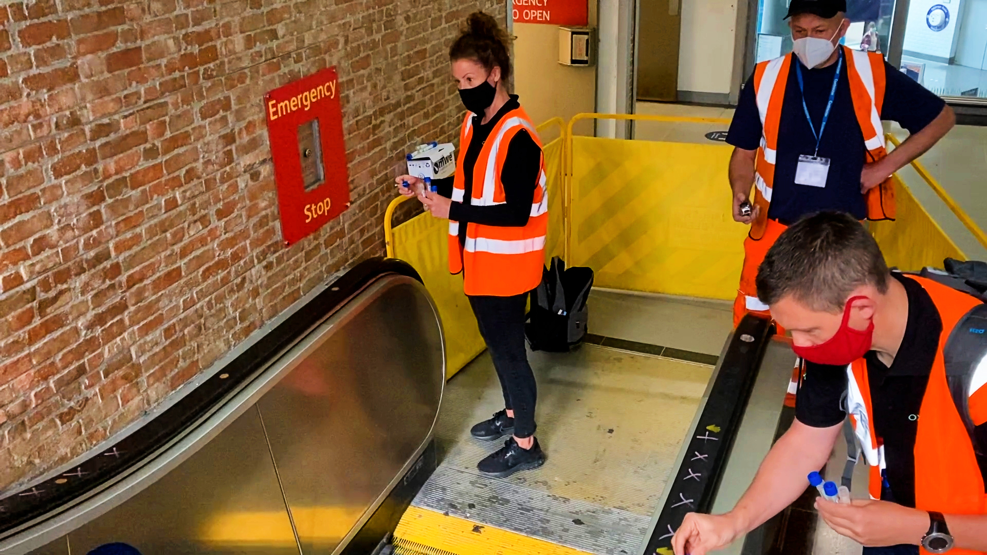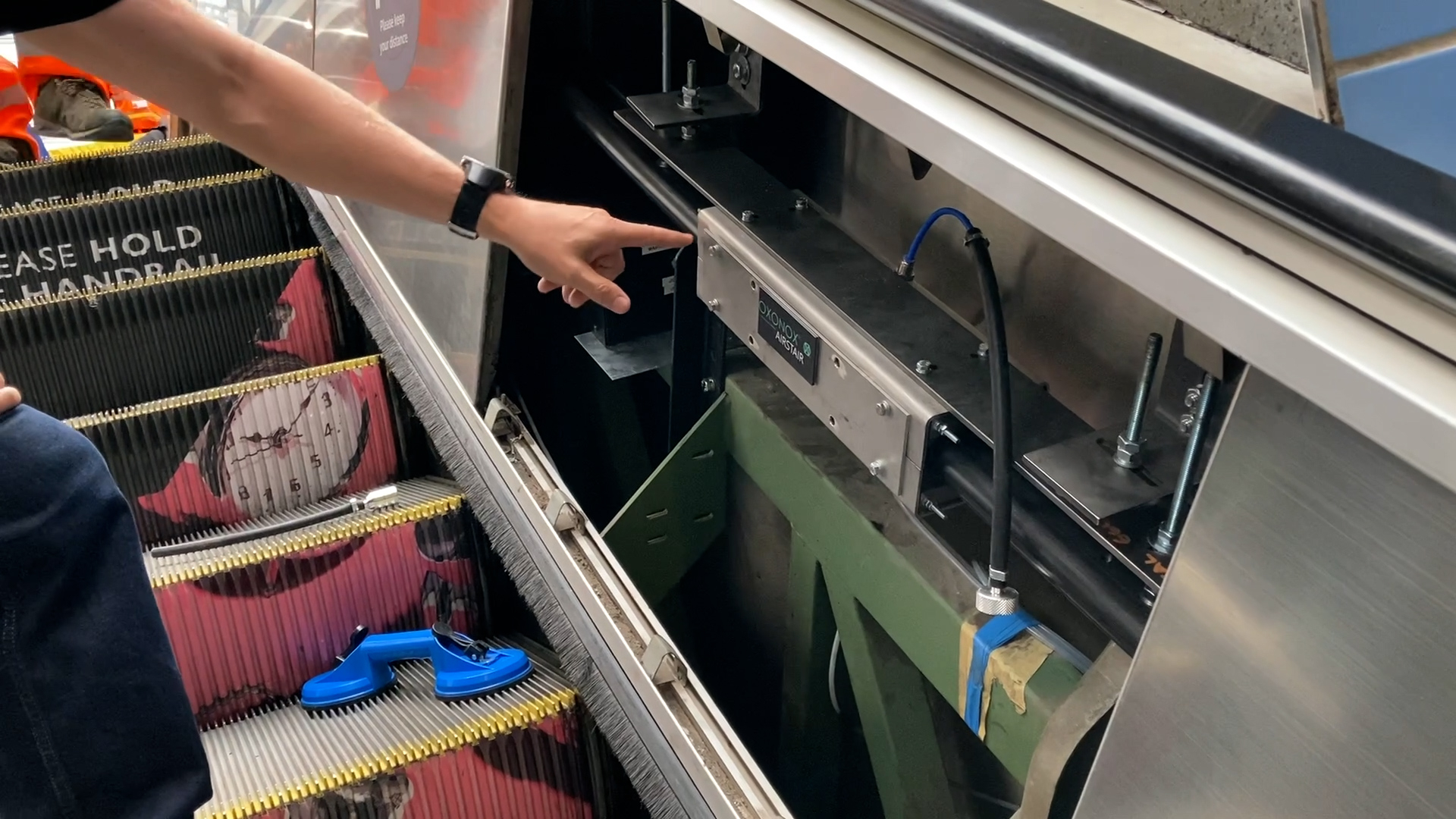 A new sanitising system has been installed inside a station escalator to continually coat its handrail with an invisible layer of disinfecting particles each time it goes around*.
